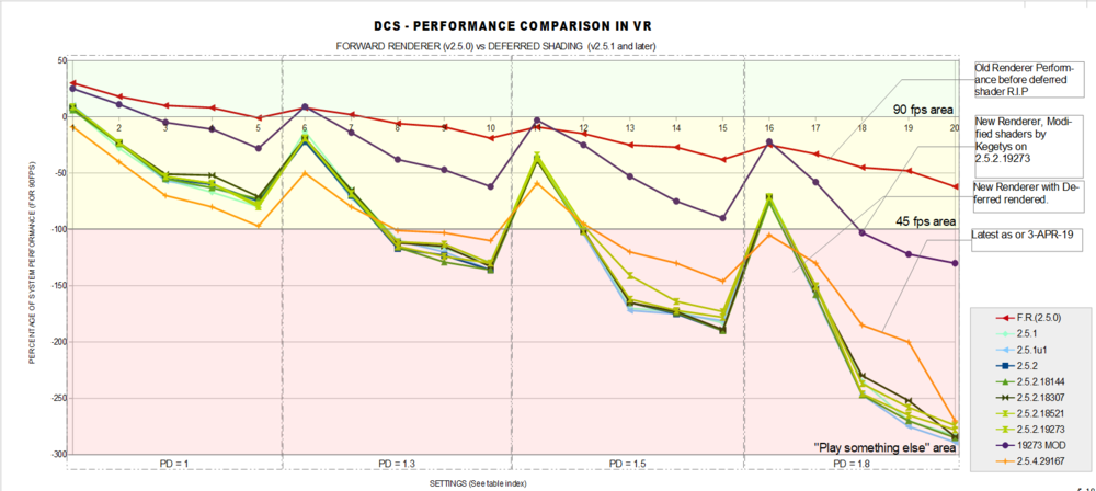 Hi all. I hate to be negative but... The latest update really killed the FPS for VR players. I hope ED takes notice and comes up with a solution. The disaster comes from the "forced deferred shading". I used to get about 80 to 90 fps on my test flight which is the Nevada free flight with the KA50. Now I get 30 to 37 with terrible visuals (anything below 45 is catastrophic for VR as all hell breaks loose). As probably most of you know the deferred shading has a very big enemy called MSAA. Which (MSAA) is an absolute must (for me at least) for the low native resolution of the Oculus headset. So I had the deferred shading off, MSAA at x4, shadows at medium and pixel density at 1.5. And I had a nice 80 to 90 fps. With ASW on a SOLID 45. All this heaven is lost as the deferred shading is now forcibly on. I have to either turn off shadows completely or turn off MSAA. With MSAA at x2 I almost get my 45 fps with bad visuals that kill the VR immersion. I really hope the ED will reconsider their decision forcing this very questionably good / bad (depends who you ask) shading method on. My system: CPU : i7 6700k at 4.6G GPU : Gigabytes G1 GTX1080 / 8GB ram / 2Ghz GPU clock RAM : 16GB ram / 3200 Mhz HDD : Separate SSD disks for DCS and windows OS :WIN10/64 pro. Test procedure described here : https://forums.eagle.ru/showpost.php?p=3549074&postcount=218 LATEST MEASUREMENTS 3-APR-2019 - 2.5.4.29167 : One year later... Modified shaders by Kegetys : Just remarkable improvement ! Addition 1: I cannot disagree with most of your posts as they mostly express personal preference. But regardless of preferences the fact is that : We had the option to play at almost 90fps with MSAAx4 and PD at 1.5. This is not there anymore. We are forcefully downgraded to 33 fps. This is almost 1/3 of the initial performance. So I think, it is important to KEEP the choice rather than not. And we should ask for that because it is to our benefit as users, even if some may not be using it. Regarding the MSAA, the sensation of pulsating scenery that is caused by the moving jaggies, totally destroys the immersion factor of VR for me. Sorry guys but I (we) have payed a lot of money in software and hardware (server owners even more...) to enjoy this game. To have things that were there, taken away, simply does not feel good. We may at least ask them back, polite and with reason. And I hope ED is reading this and working on a solution. I hope. Cheers Addition 2: Hi All. Always use sunscreen. For the tl;dr : - with DS, my VR experience is bad no matter the tweaking. - On line streaming is out of the question (Oculus mirror). - Deferred Shading does not produce better results. Bad implementations produce bad results. - D.S. may be the wrong selection for a flight simulator. Creates more problems that solves. - We have more than enough computing power to have excellent VR experiences and performance. - DCS seems in a permanent state of "work in progress"; including all (?) modules; prepaid W.I.P. that never get finished. Still awake ? read on, we'll fix that. I spent the entire weekend trying to find a set-up that will let me use the new scheme. Unfortunately, although I tried to see only the positive side, I was left with disappointment. The previous "experience quality" (for VR) is not comparable to the new one. I was toying with on-line streaming. I did a couple of tests and all was fine. I use Oculus mirror to create another window with proper ratio, let's say 16:9. Then capture, compress and stream that; while playing is VR. Well,,, you can forget that now. Plus the sacrificed visual quality is BAD on a monitor. While searching the forums for any missed tips, I noticed an interesting trend. People defend Deferred Shading because "it produces better image quality". I do not know how on earth this came about, at least on the technical side. Both available rendering pipelines (and many many more), IF WELL IMPLEMENTED, should be able to produce indistinguishable results. And like any tool, each one is better at one thing or the other. The strong point of deferred shading is the ability to produce lighting and shadows from many many light sources quite fast. That's about it. Now think, is this an FPS game, let's say Battlefield, where multiple light sources illuminating the scene (and producing shadows), really make a difference in the scene itself (and immersion) ? Is THIS the one thing that is missing from DCS ? Why on earth do you want that on a flight simulator ? We cannot even use "Cockpit Global Illumination" because of the extra FPS hit. And the biggest irony of all is that in order to have a decent frame rate in VR, you should turn off shadows completely (has even been suggested above !!!!!) Why the hell do I need DS in the first place then ? half of it's job is gone wasted. Another misconception is that at the moment there is not enough computing power to have a decent VR experience. This is very far from the truth. We have two key components, massive processing power and parallelism. If used properly the results may be amazing. I saw Aerofly FS2 mentioned elsewhere. I have this title and although of a totally different nature, is amazing in visual quality. IL-2 (I have almost all of them) are very, very good when it comes to VR quality. Even prepar3d v4 is getting very good at VR. And they have one unique and valuable feature : you can switch between monitor/ VR headset mid-game. But the title that is the golden standard (for me) of VR performance is Combat Air Patrol 2 (another title I bought). It demonstrates the capability of VR. Has to be flown to be believed. The fluidity at PD of 1.5 and everything maxed out, makes for an unforgettable experience. So, everybody is improving and DCS is going in reverse ? It's my favorite flight simulator for God's sake. I pay and run two servers for them, I talk with actions not simply words. Anyway, I still hope that they will rethink their decision and will at least give people the choic