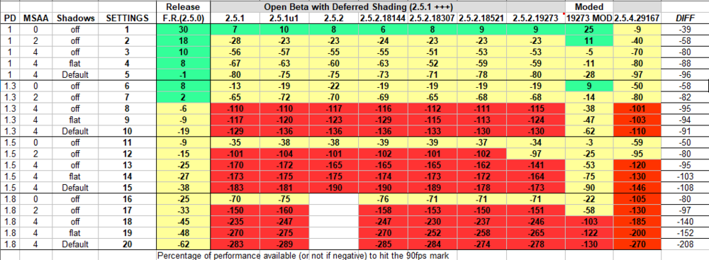 Hi ! 2.5.1 is in no way able to produce anything playable with these settings. Thus this whole thread. In 2.5.0 (current stable) as well as in 1.5.8 are all playable with 45 fps stable with ASW (very pleasant also). Plus our HDMs do not have the same pixels : Oculus : 2160x1200 = 2.592 Mpixels Odyssey : 2880x1600 = 4.608 Mpixels To match your pixel density I would have to start at 1.33 ! If you multiply your HMD's native pixels with increasing PD you run very fast to huge amounts of pixels. Do not forget that PD multiplies vertical as well as horizontal, so it's effect on GPU workload and memory requirements are squared ! Take also in consideration that one big disadvantage of Deferred Shading is big memory requirements (another reason why DS is bad for VR and high PD). The card you need probably does not exist yet. My system : i7 6700k at 4.6G Gigabytes G1 GTX1080 / 8GB ram / 2Ghz GPU clock 16GB ram / 3200 Mhz Separate SSD disks for DCS and windows WIN10/64 pro.
