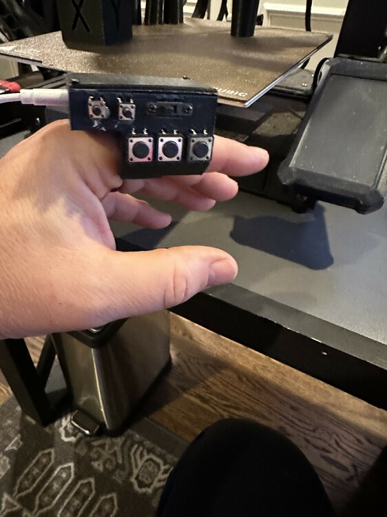 After a several year hiatus from flight summing, VR pulled me back in. VR is a complete game changer. After starting with VR, I quickly realized the importance of using a kneeboard and coming up with a way of interacting with the cockpit buttons/switches. After doing some homework and research, I finally discovered the product Point Ctrl. I was eager to order one, and then I realized there was a year or more wait. I ordered me one on January 16, 2022…and still waiting. While waiting, I had no choice but to come up with another solution. Here is the solution I have until I get something better. Here is a picture. I tried many different designs, but the one that worked best is the one that attaches on the finger. Here is a list of features for the HID: Wireless, bluetooths to computer. (The white dongle in the picture is only used for charging) 500 mAh rechargeable battery Has IMU with 9 DoF. (Accelerometer, gyro, magnetometer) Sensor fusion algorithm is Madgwick Main control board is Adafruit Feather Sense The buttons on the unit have the following actions: Top left button toggles bluetooth on/off Top right button controls sensitivity Bottom left button sets center for HID orientation Bottom middle button (left mouse click) Bottom right button (right mouse click) On/off switch at top right The main DIY skillsets needed to build this HID are: 3D printing (I used Fusion 360 to design the controller body and lid) Soldering (only requires basic skills of thru hole components) Loading software on mainboard (I can provide the code for it). I did my initial code using Platform IO and then switched to Arduino IDE. Code in C++ Calibrating magnetometer using Motion Cal The data for the IMU sensors are converted to AHRS using the Madgwick library. Once the roll, pitch, and yaw of the HID are known, it is converted into mouse units. The units are absolute from the center of the VR HMD view. The pointer in the cockpit is controlled by translating or rotating the wrist/finger. I find it works great on the left hand on the throttle. With simple movements of the left hand, I have cursor control in the cockpit. I tried making one for the right hand as well, but it interfered with the flight stick and I could not wrap my fingers on the stick. I am curious as to how well PointCTRL works when being attached to the right finger. I could not come up with a design for the right hand that felt comfortable. It is not really needed though since the left hand works so well. I have tweaked the sensitivity to my liking and use motion smoothing for nice fine control. I am getting ready to build me another one. If anyone is interested, I can fully document every step of the process and make that available.