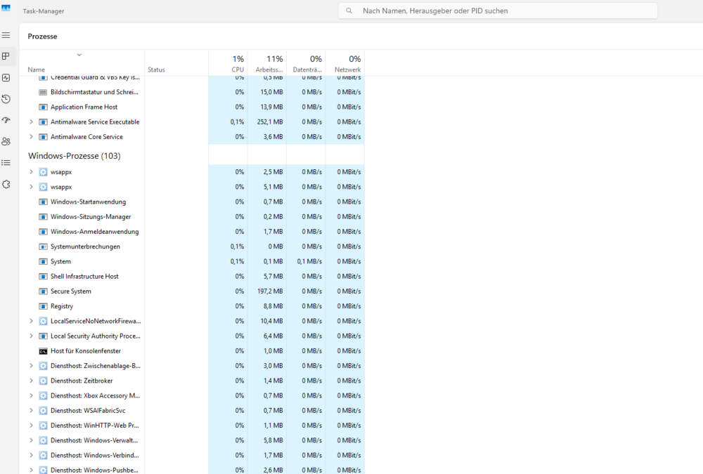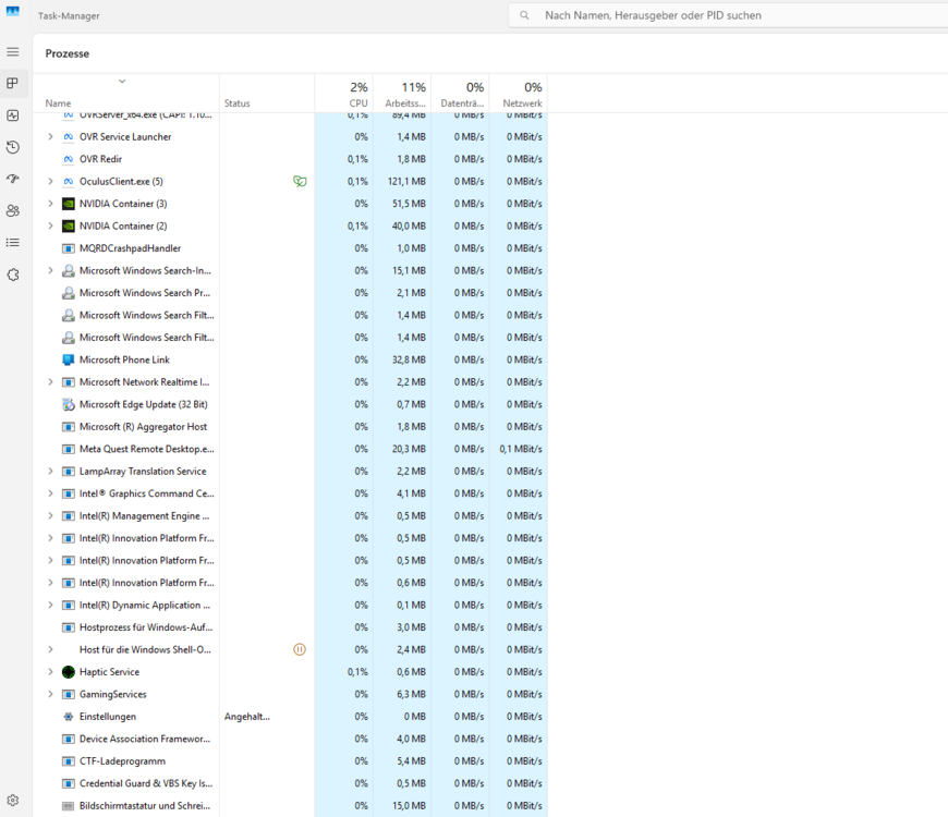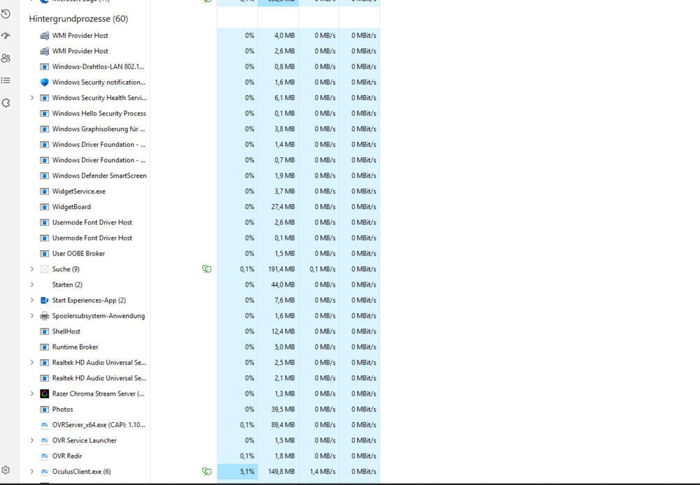 I have nothing running. as i told you i have a clean windows installation. i had just Parkcontrol one time activated to deaktivate coreparking. but its not running anymore just started once. The only things i installed myself is the razr software for my keyboard and the oculus link app for my quest3 VR headset. I made u some screenshots from the backround takes in taskmanager. maybe u will find some strange things. Btw: i installed also now Gforce Expierience to go shure that the nVidia Overlay is disabled. .