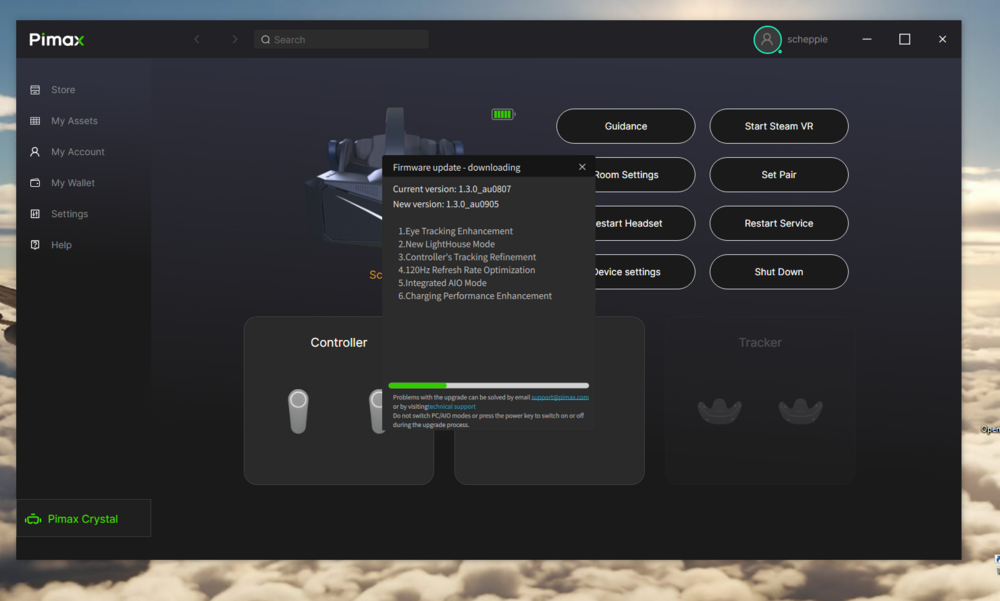 Headaset Firmware: 1103** Controller Firmware: 0.3.38** Pimax Play: 1.17.01** ## General: 1. Headset Power Led Reworked** PCVR Mode** - Blue light when headset is powered on.* - Green light when successfully connected to PC and functioning properly.* - Yellow light when headset is charging.* - White light when charging is completed.* AIO Mode** - Green light upon successful startup.* 2. Dual Audio Mode** - Introduced dual audio mode “Low Latency” and “Standard” - Enhanced the audio experience in low latency mode.* 3. Microphone Audio Enhancement** - Addressed the issue of low microphone volume in several instances; VRChat, DCS and more.* 4. Power Consumption** - Addressed 0915v power consumption issue.* 5. Smart Smoothing bug** - Fixed the Smart Smoothing bug happened on 1.16 client.* 6. 72Hz Refresh Rate** - Introduced 72Hz Refresh Rate* ## **PimaxPlay:** 1. Room Settings - Disable Reminder Option** - Added an option in room settings to disable future reminders. Users can now choose note to receive certain prompts when launching PimaxPlay.* 2. Added Game Import Feature** - PimaxPlay’s resource library now supports local game imports, allowing users to manually add games from their local computer for use with PimaxPlay.* 3. Bug Fixed** - Fixed abnormal local dimming adjustments.* - Corrected issues with brightness adjustments.* - Resolved the bug causing PimaxPlay to show a DLL file in use prompt.* - Eliminated the white edge in the headset display.* Verstuurd vanaf mijn CPH2399 met Tapatalk -