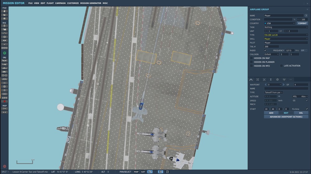 Что точно ясно,так это то, что возможности выбора парковочных мест на старом добром Кузе и Стеньке нет. Факт что тем не менее это всё же возможно используя непонятный трюк который применён в тренировочной миссии для Хорнета - "Lesson 9- Carrier Taxi and Takeoff". Отсюда просьба узнать у ребят делавших эту миссию о способе позволяющем такое. Хотя бы как временное решение. Пока не будет реализована такая возможность должным образом - с возможностью расстановки бортов на палубе средствами редактора. Можете вы узнать у сведующих ребят как они это сделали. И поделиться этим способом? Спасибо!