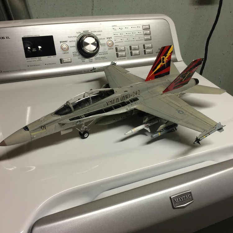 Just wanted to show my excitement for the F/A 18C just pre ordered it last week of January. This is Marine Corp F/A 18D VMFA 242 RED DEVILS 1/32 scale Academy kit. This is on my Washing Machine it is loaded with 2 sidewinders, 1xAGM 65,AGM 88 on the other wing is GBU 32 JDAM & an AGM 84 Harpoon. The Belly has one Aim 120 & Flir Pod. The centerline drop tank says Mors Ex Tenebris (Translates Death from Darkness). More photos soon. The other two photo's are from September 2016 at London Ontario air show Cf188. RCAF which I believe are heavily modified F/A 18A variants. Anyway ED can't Effing wait so pumped.