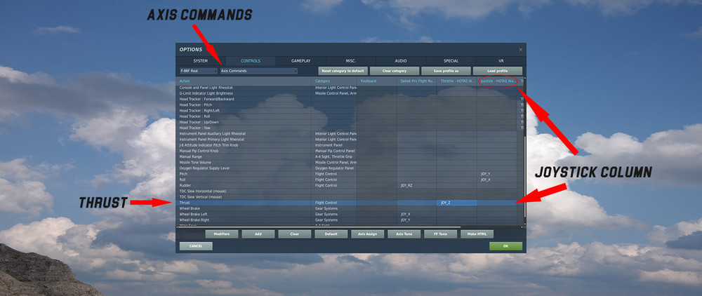 How to map my throttle/thrust to the slider on my joy stickMad_Max2 replied to LA1's topic in DCS: F-86F Sabre Options>>Controls>>Axis commands>>Thrust In the joystick column> add> move the axis you want. ** the attached pic might help more. Keep in mind I have a HOTAS so I have mine set under the throttle column. It sounds like your throttle is on your stick, so it will be in the respective column.
