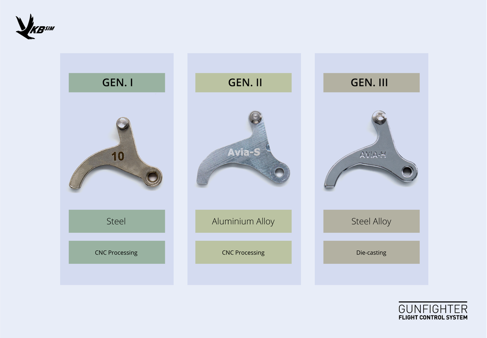So, what's that about cams in your Gunfighters being different? Some people're wondering, I only got my GF a few months back, and when I bought the second for my left hand now I saw the cams were different. How to tell older from newer? What cams are better? Now, here is the story (and before the story, here is the picture). The FIRST generation cams were CNC'ed from steel. Used in models: Mamba, Gladiator Pro, GF1, GF2. Good: hard, lasts forever. Bad: may corrode in humid climate, as well as during long sea shipment. Solution: this contradiction was dealt with by chromium powder plating. While working on GF3, we thought what could be done to perfect the working surface smoothness in mass production. Inevitable tiny scratches called for hand polishing which in mass production is something we wanted to avoid by all means. Also, polishing would effectively damage the chromium plating, which in turn called for using of protective lubrication. This is how hardened aluminum cams came, marking the SECOND generation of cams. Good: hard enough. Good: doesn't rust. Good: transparent electroplating offered further protection. Bad: sometimes we still had to hand polish the cams. Solution: eliminating CNC as such. This brought to life the THIRD generation of cams. That would be cast rather than cut. What's new (i.e., Good): special proprietary steel alloy. Good: greatly improved resistance to corrosion. Good: nearly zero need in hand polishing. Good: chromium plating has no protective function and is merely used for visual pleasure. Bad: remains to be found... if any. In a word, we made the cams nearly perfect. Cams are the heart of the gimbal, and this heart by VKB is strong, durable, reliable (and not easy to upset). Important: for the end users there is no detectable tactile difference at all. All difference is in technology and streamlining the production. Plus, of course, adding to longevity of the cams (but even the 1st gen cams in fact are made to last forever under normal usage conditions). By the way... T-rudders are now sporting 3rd gen cams as well!