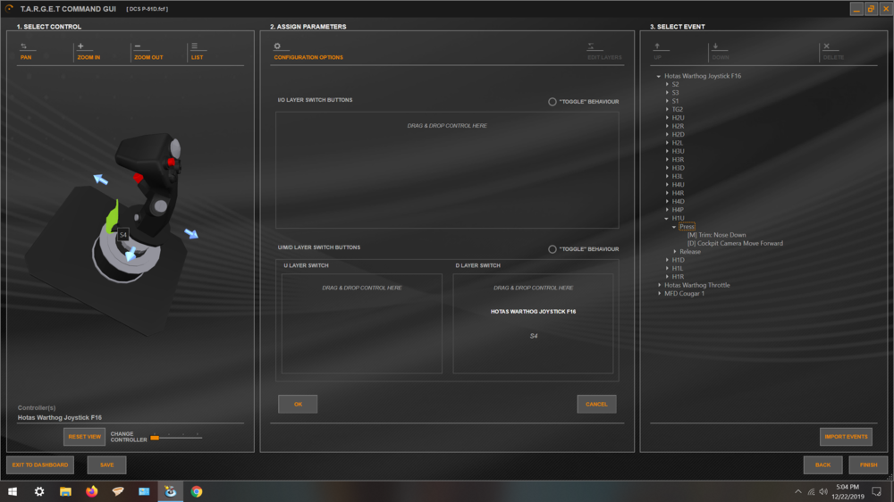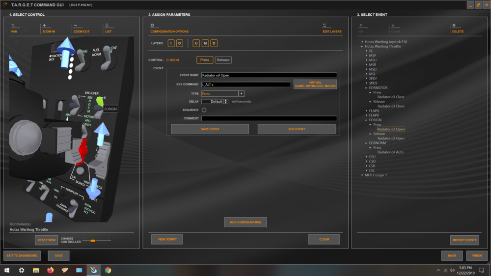 TARGET does all that too. Maybe something is getting lost in translation here, I can barely code "Hello World" in C++. The GUI generates the code for you. There's no coding necessary. There's no way I would be able to do that without the GUI. The user interface makes it all point and click. Easy peasy. It even gives you a 3D model of the controller and you just click on the button you want to assign. Much better than the wall of text in the DCS speadsheet. If I can do it, anybody can do it. I'm into hardware and benchmarking, I'm not a coder by any stretch of the imagination. I can't even read the text scripts you guys keep posting. Looks like Ancient Greek to me. One thing I noticed when I was working through your F-16 script in Foxy is that you went through a lot of trouble to emulate key presses for a lot functions that were already in DCS as joystick buttons. I'm not sure about FOXY, but TARGET can emulate all 32 joystick buttons and the 8 way hat. The DCS developers did a fantastic job of mapping all the joystick functions already and you were kind of reinventing the wheel. I just emulated the joystick buttons as typical press and releases like the default and it worked great. I did steal your idea for mapping the landing gear lever as a layer under the speedbrake switch and it worked great. Just an FYI. -