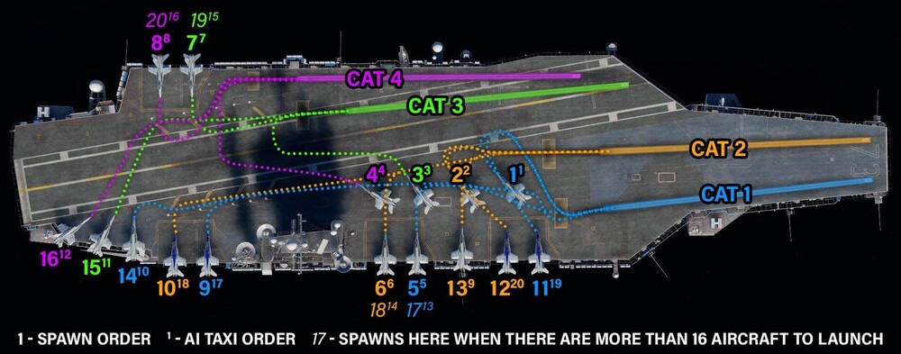 The rest should be good, I think I just missed that mission. All aircraft spawns have a single, predetermined cat. You can put a static in those particular spots to prevent a cat use. For example, blocking the slot in front of forward starboard elevator can prevent cat 1 yo be used. I missed it in that previous mission.- 435 replies