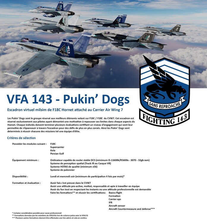 Nous somment en recrutement et nous avons quelles positions de disponible! Le VFA-143v (virtuel) fut créé en 2019 pendant la crise sanitaire du Covid 19. Le groupe a rapidement grandi avec plusieurs nouveaux pilotes désireux d'apprendre les bases du vol sur DCS et les systèmes du F/A-18c. Nous sommes toujours à la recherche de pilotes sérieux, motivés et désireux d'apprendre. Donc si vous recherchez un groupe qui vole plus pour le plaisir que le Mils- sims mais en même temps recherche le réalisme vous êtes bienvenue parmi nous. Nous offrons aussi l'entrainement de base a avancé sur le Hornet. Bienvenus au débutant Avion aux couleurs de l'escadron avec casque et uniforme! Nous sommes du Quebec.