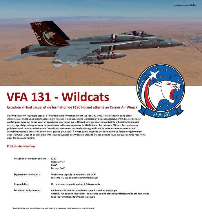 Nous somment en recrutement et nous avons quelles positions de disponible! Le VFA-143 et VFA-131 (virtuel) fut créé en 2019 pendant la crise sanitaire du Covid 19. Le groupe a rapidement grandi avec plusieurs nouveaux pilotes désireux d'apprendre les bases du vol sur DCS et les systèmes du F/A-18c. Nous sommes toujours à la recherche de pilotes sérieux, motivés et désireux d'apprendre. Donc si vous recherchez un groupe qui vole plus pour le plaisir que le Mils- sims mais en même temps recherche le réalisme vous êtes bienvenue parmi nous. Nos journées de vol sont les lundi et mercredi de 2000 a 2300 heure de l'Est (Montréal). Nous offrons aussi l'entrainement de base a avancé sur le Hornet. Bienvenus au débutant Avion aux couleurs de l'escadron avec casque et uniforme! Nous sommes du Quebec. Carrier Air Wing Seven (DCS-Qc) | Facebook
