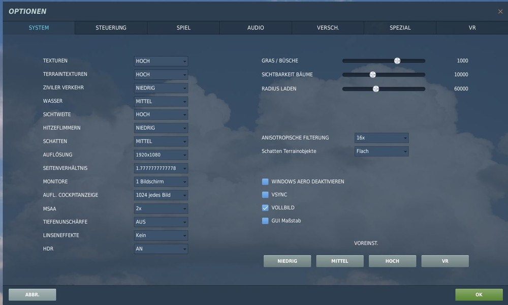 Moin Gemeinde, zunächst einmal wünsche ich euch allen einen guten Rutsch ins neue Jahr!:) Heute bin ich eine schnelle Trainingsrunde geflogen und habew mir ein wenig Wetter gebastelt... Ab 5000 ft. durchstosse ich die Wolkendecke, aber dort habe ich übles Grafikflickern... Sobald ich wieder in/unter den Wolken bin, ist es wieder normal... Ich meine, hier im Foprum schon mal was dazu gelesen zu haben, kann den Beitrag aber nicht mehr finden...:cry: Kennt das jemand von euch und gibt es dafür eine Lösung? Ach ja, ich fliege die Version 1.5.8 aktuell stable. VG