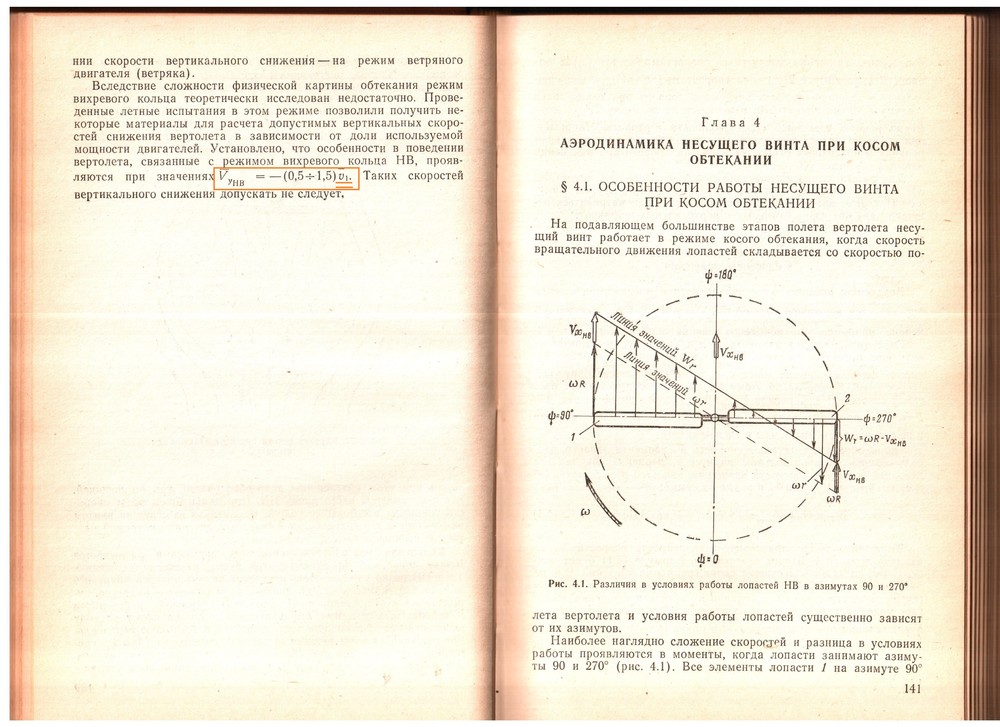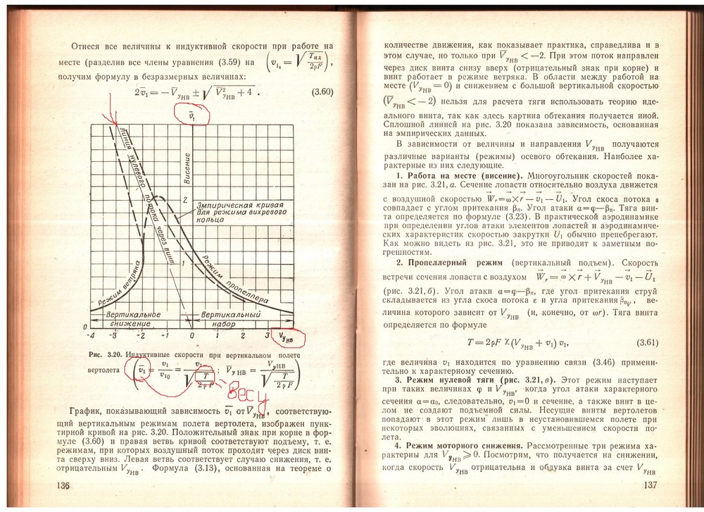 Это желтые страницы Ромасевича На графике видна прямая НУЛЕВОГО ПОТОКА ЧЕРЕЗ ВИНТ она выражает линейную зависимость вертикальной скорости от индуктивной скорости, при которой образуется вихрь. видно что ЭМПИРИЧЕСКАЯ (получена опытами для конкретного винта) кривая для РВК увлекается почти вдоль этой прямой. Из формулы видна зависимость ИНДУКТИВНОЙ СКОРОСТИ U1 от Тяги (теория "Идеального винта") тяга в свою очередь равна весу вертолёта. на другой странице формула зависимости Критической вертикальной скорости в зависимости от индуктивной скорости( которая зависит от массы)