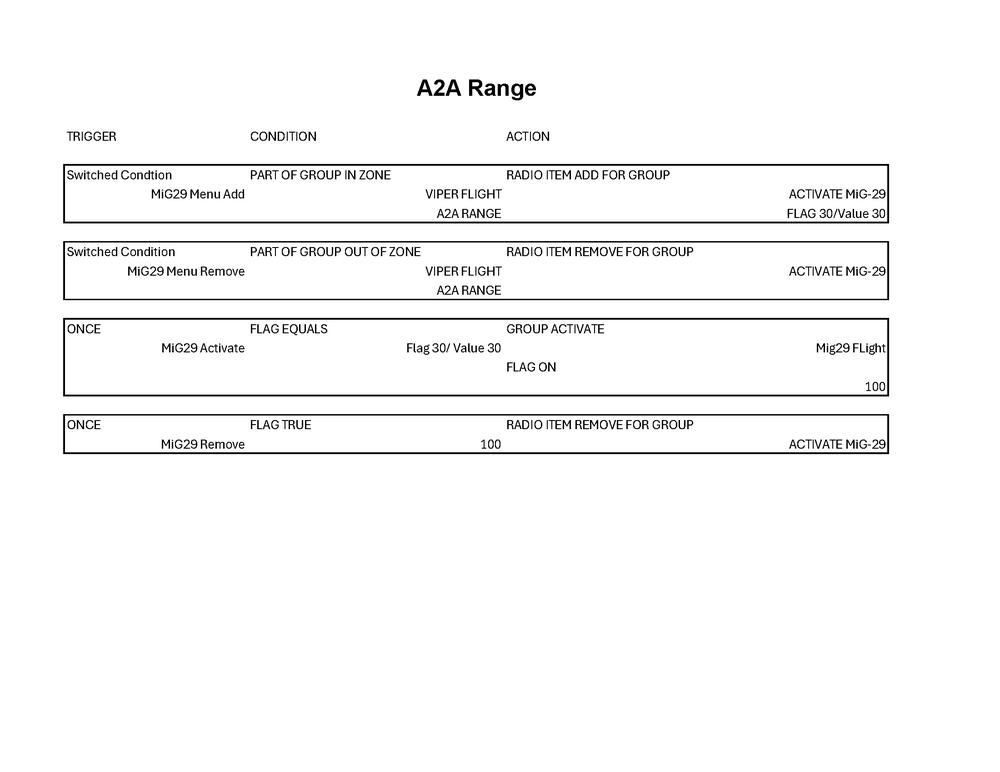 Gents, I could use some help with some advanced Trigger setup. Here's a overview of what I am trying to accomplish: Have two separate "ranges" on a map for training. A SAM range and a A2A range (air to air). Setup a trigger zone for each range When a plane enters the A2A range, a F10 menu will pop up with options to select. For example, MiG29, F-5 etc. If the plane does NOT activate any aircraft but leaves the trigger zone, I want the F10 menu to disappear If the plane then re-enters the menu pops back up Here's the complicated part - Once you activate an asset (the MiG29 for example) then I want that removed from the F10 menu permanently no matter how many times you exit/re-enter the range. Also, another complicated part, is I only want the F10 menu to appear for the group that is entering the range and if there is a group entering another range, their menu is for that range specifically. Where I am having issues is once you activate an asset and leave the range, once you re-enter the F10 menu item reappears, even though you can't select it anymore. Any ideas?? Attached is a visual representation of what I want and an example of the current trigger solution I am attempting.
