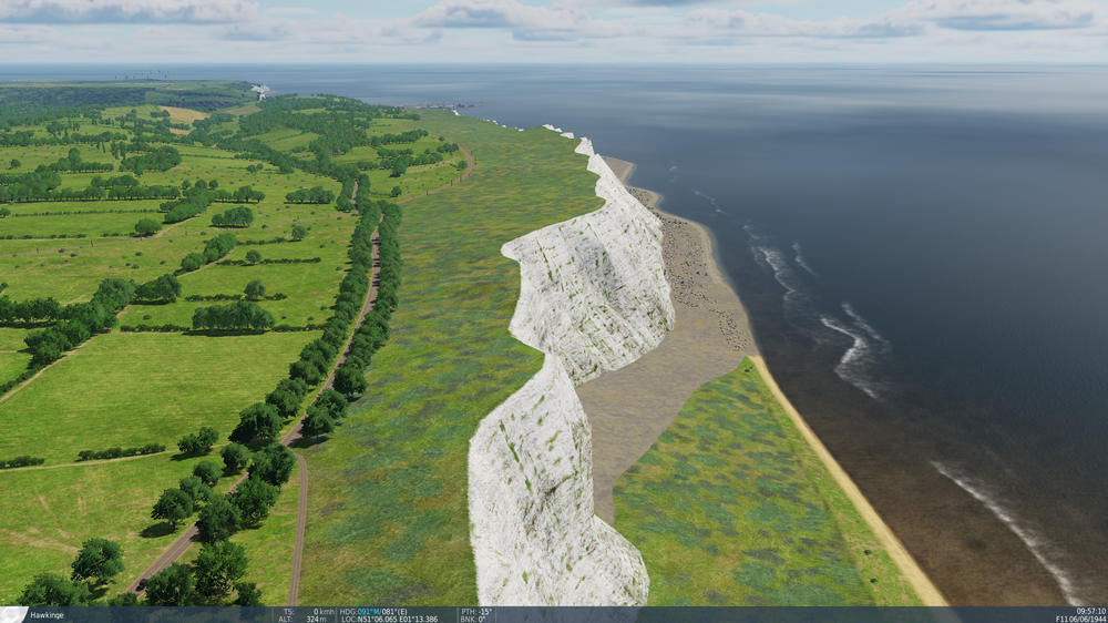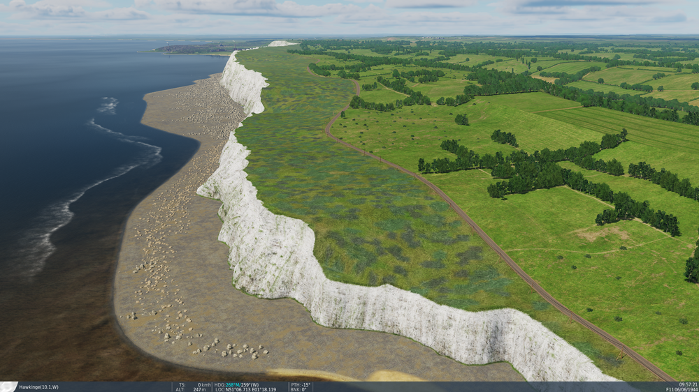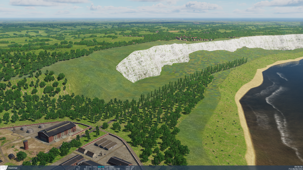 It looks like multiple trees disappeared between Folkestone and Dover in the most recent feature update. Texture in this area indicates that it wasn't a grass only land in previous patches, I guess (and hope) this wasn't intentional. Here's a picture from teases before the release where you can see that trees are present in this area: