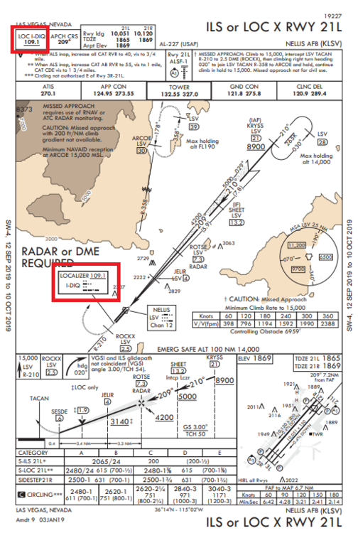 To answer the question. If it is implemented, it should be 109.1 This assumes it's actually in the game and ED didn't use a random number. However, Tholozor is correct in that all you have is a TACAN for land based approaches in the Hornet. Attached is the ILS into KLSV. Cheers, Thump