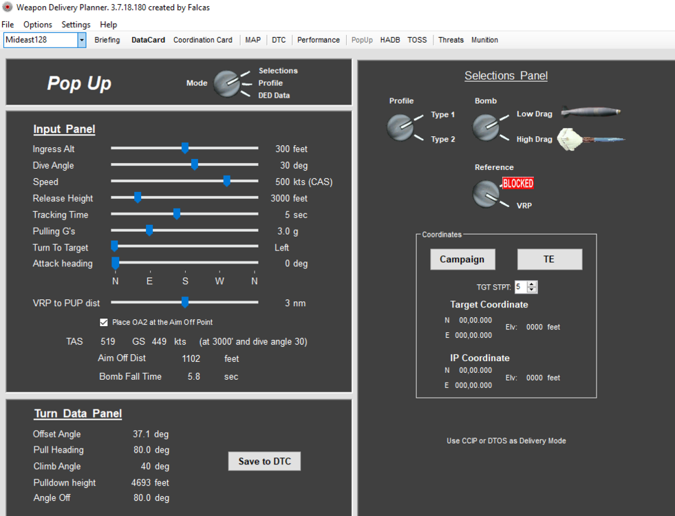 About the request for the OA1/2 VRP and VIP coordinates adding would be awesome. This is the older Weapon Delivery Planner for Falcon BMS that I was referencing. Its an amazingly powerful tool There are several manuals also on the WDP website discussing the features and its all free. Obviously doesnt work with DCS nor do I have the programming know how to edit the GUI and add the OA1/2 and VRP/VIP as entry macros to the DTC. Thanks again for the time and consideration. ! -