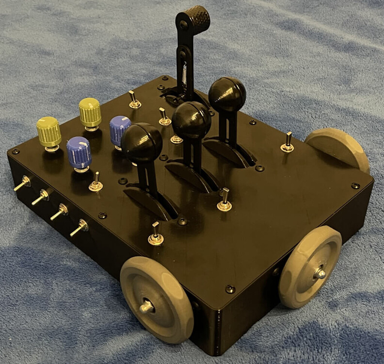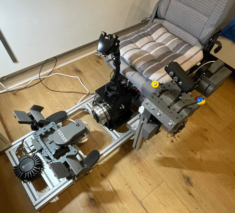 Hallo zusammen. Ich möchte euch gerne zeigen, was ich mir ausgedacht habe. Aber ich möchte das Gasbedienfeld im Mustang-Stil neu gestalten. Und ein separates Getriebe für das Fahrwerk hinzufügen. Übrigens: Durch die Umstellung auf 24-V-Stromversorgung, die Reduzierung der Höhe des Joystick-Getriebes auf 215 mm und die Vergrößerung der großen Zahnräder auf 68 Zähne habe ich bei 40 cm Griffhöhe 17 kg auf den Joystick gebracht!!! Und mit meinen alten Pedalen habe ich 40 kg geschafft!!! -