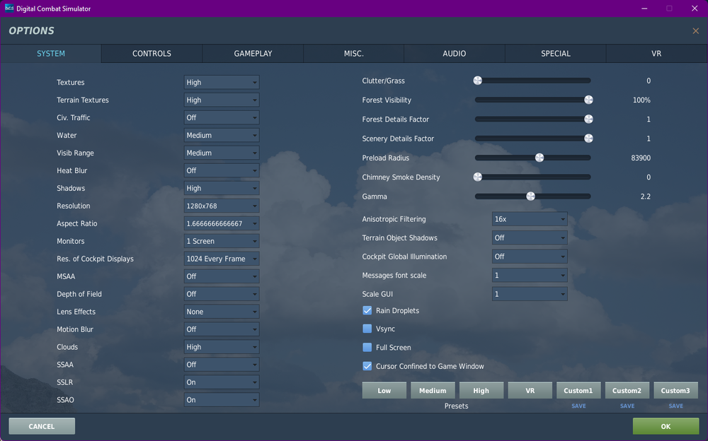 I went through that list of links I posted for you above and did some of the optimization mods myself, played with setting etc as suggest and I got a boost which I am pretty happy with but for the hell of it I checked and I can tell you that I am pretty sure I know what your problem is. It is your PD. I believe you are asking too much. Way to much. If anyone knows how to get a good FPS and have it look half decent with that PD please let me know how. Like I said I can't see sigs on the browser. Some extension is blocking it so I just updated mine to what I am running. It is a little more powerful then yours but I am running the rift S so I am not needing to push the pixels you have to. With that in mind these are roughly the FPS numbers I was getting in my test map with my preferred graphics settings. PD 2.5 FPS mid 20's. ASW on or off, didn't matter. Unplayable. PD 2.0 Low to mid 30's. ASW on or off didn't matter as it needs to min of 40 fps with my Rift S. Crappy. Horrible. PD 1.5 Could pull 40 up to 60's but would sometimes duck below 40. ASW helped smooth things out a bit but it would stutter sometimes because of the sub 40's. Not working for me. PD 1.2 Up to 80fps and ducked to the 60's with ASW off. Some jitters as the FPS was not stable. Sure was pretty on the fly byes though when it was. I could lock it at 40fps with no ASW (CTRL +num2) and it would stay there rock stable. Still at 40 fps I can see those frames. No ghosting tho. Acceptable sort of for me. I could lock it to 40fps with ASW on (CTRL+Num3) and it was butter smooth. Some ghosting on the fly byes but this is the sweet spot for me. There is no way I can think of to get good FPS at the PD's you are running at, with a Rift S and my rig and my preferred graphics settings which suit me. If I run the default low setting in DCS and a PD of 2.0 I can get a stable 80fps on my test map but it looks horrible. Clear, but I can clearly see the horrible. On another test map I have that has a lot of combat units doing their thing it can jump from 80 to high 30's so I get the worst of both haha. TL/DR. I think your PD is way to high. I suggest yo try DCS on the default low settings with that PD and see what you get. If you get great FPS then that is for sure your problem and then you have to work out what you want to trade and see if you can find a balance you can be happy with. For reference this is my preferred setting ATM though I am sure that will change in the next 10 minutes. Having fun seeing what I can actually get out of it.