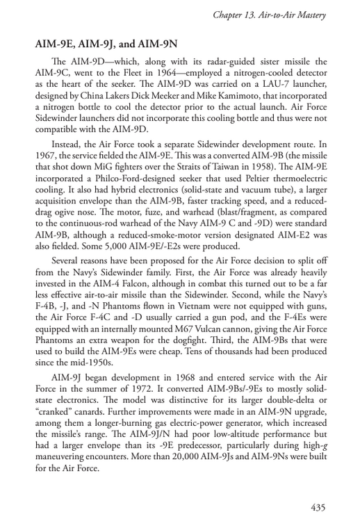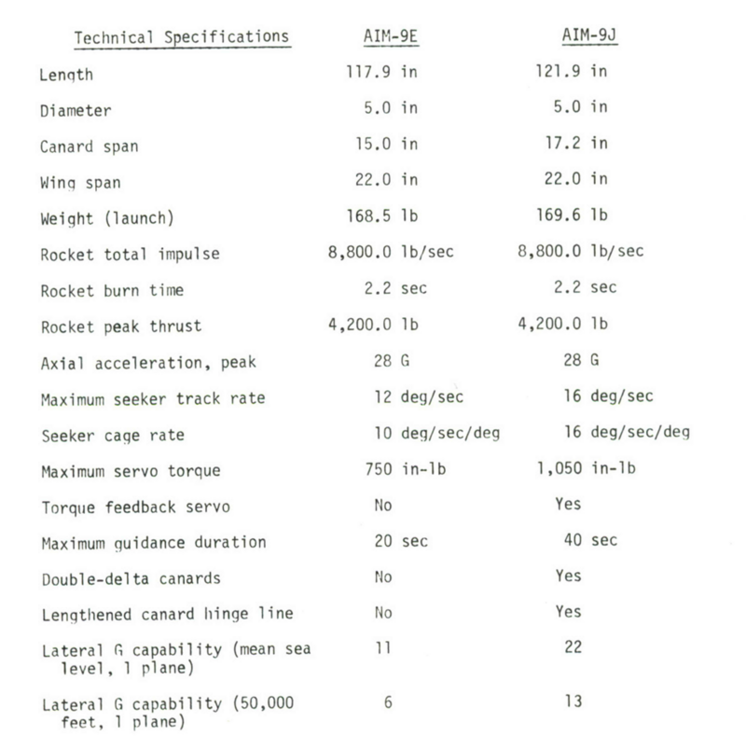 Iam sorry but i dont really know where to place this as i cant find any wishlist or generally weapon thread other than this. But even then, its quite important to get this missile with upcomming F4E this month and in the future, F-100. The sidewinder in question is in fact Aim-9E, for some, it might be unknown missile, it wasnt any stellar weapon like 9L for its time but it was rather decentish upgrade for USAF birds over vietnam over 9B but it never really solved issues of 9B. Its main upgrades were ability to uncage seeker prior to launch, more advanced cooled seekerhead and more aerodynamic tip. Otherwise it was same missile as 9B, same engine, fins,, warhead, G capabilities but should gain a little bit in range due to better aerodynamics over 9B. Unlike more modern sidewinders, we actually have quite enough information for basic performance of missile exept its range as i cant find any info on that as of now (will try to). There would be additional possibility of getting said missile with SR116 reduced smoke engine which 9P2/3/4/5 uses. With upcomming USAF cold war modules, it would be really nice to get this early sidewinder for them. From HOLDING THE COURSE history of the navy at china lake, California volume5 By Cliff Lawson null Declassification of information below null