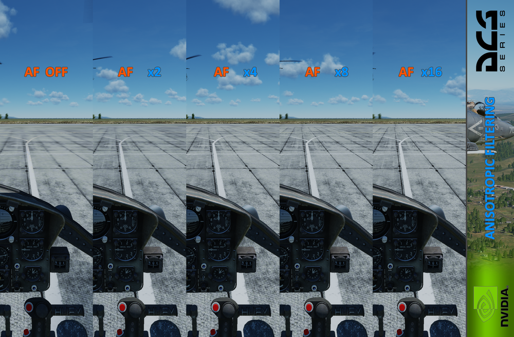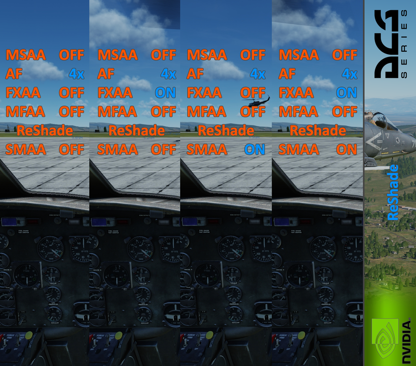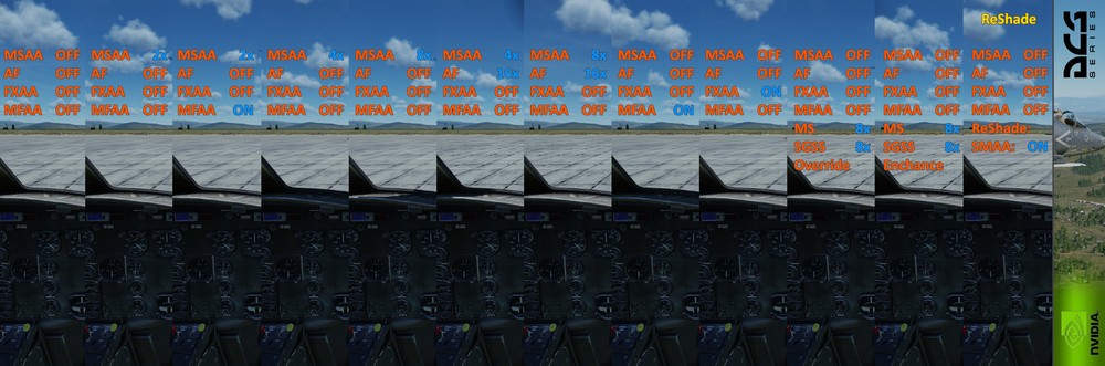 As i've seen some topics about how Antialiasing of DCS or Nvidia are working i tried to make a little comparisons to see clearly the differences. I will try to expand these comparisons if u want and also try out ReShade to see what we get there. All screenshots are made with following basic DCS Settings: Resolution: 3440x1440 Texture: High Terrain Texture: High civil Traffic: Off Water: High Visib Range: High Heat Blur: Low Shadows: High Res. of Cockpit Displays: 512 Depth of Field: Off HDR: Off Deferred Shading: On Terrain Object Shadows: Flat Cockpit Global Illumination: Off Disable Aero Interface : On VSync: On Fullscreen: On Scale GUI: Off DCS and Nvidia Settings Explanation from Left to Right: All Off: Standard picture which u get with no Antialiasing from DCS or Nvidia MSAA 2x: Edges looking much smoother MSAA 2x + MFAA ON: Slighty improve to only MSAA x2. Looks like something between MSAA x2 and x4 MSAA 4x: Not really a huge step compared to MSAA 2x MSAA 8x: Much clearer picture then MSAA OFF but we all know that with MSAA the FPS will significant drop down MSAA 4x and AF 16x: Like MSAA 4x but also u see for example Ground Textures getting much sharper. Because AF only affects sharpnes not the AntiAliasing. MSAA 8x and AF 16x: Like MSAA 8x but also u see for example Ground Textures getting much sharper. Because AF only affects sharpnes not the AntiAliasing. MFAA On: Turned via Nvidia Inspector the MFAA to On but there isnt really a difference between All Off and MFAA ON FXAA On: We can see a increase in sharpness between the different 3D Objects for example Hill/Sky MS 8x and SGSS 8x with Override: Used MS and SGSS with Nvidia Inspector and the "Override any application settings". No nitciable differences. MS 8x and SGSS 8x with Enchance: Used MS and SGSS with Nvidia Inspector and the "Enchance the application settings". No nitciable differences. All Off + ReShade SMAA On: U see a small increase in quality between the different 3D objects. For Example the Hill or the Frame of the Huey. NOTICE: Its not possible to make screenshots InGame and see afterwards the ReShade effect. ReShade is a Filter which not get captured by DCS screenshots. If u want to take screenshots with ReShade visible i used for Example Gyazo. Anisotropic Filtering: Here i made a comparison between the different AF Settings of DCS. U can see on the ground textures that the sharpness range increases step by step by increasing the AF from OFF to x16 Benefits of ReShade I will show in the following comparison the differences between FXAA, SMAA and both together. Therefore im using ReShade. FXAA OFF and SMAA OFF That u will see without having something turned on FXAA ON Here u see a little improvement with less FPS cost SMAA ON U see that Reshade is giving u also little improvement FXAA ON and SMAA ON This is a little improvement paired with a small improvement of SMAA