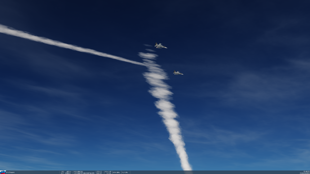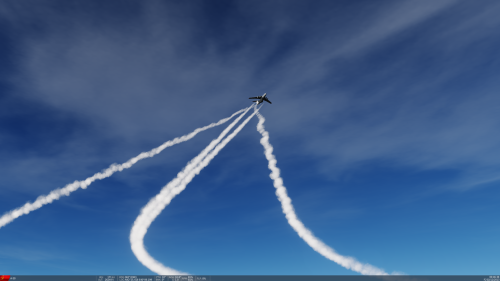 I probably identify when it happens. I´m using tracks for "saving" of my progress in a long missions. When I want to continue with my mission, I open the track file, press F10 and accelerate the time to the point where I want to continue. In this case the strange behaviour occurs. Besides contrails I can see some graphical glitch behind some ships too.