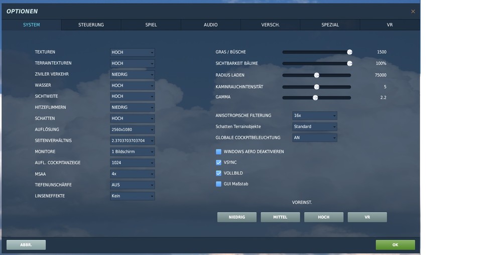 Hi Creature 1stVFW, Delete: C:\User\YourName\Saved Games\DCS\Config\options.lua Delete: C:\User\YourName\Saved Games\DCS\fxo Delete: C:\User\YourName\Saved Games\DCS\metashaders Delete: C:\User\YourName\Saved Games\DCS\metashaders2 Then make a Intigrity-Check of DCS (Simply, this is the Repair Function of your DCS Updater or Steam. As next Step, start DCS and make your Configuration in Settings. Then Start a Flight. Now, DCS will write the Configfile (options.lua) and all the Shaders again. I hope this could help you. Best Regards, Coffee