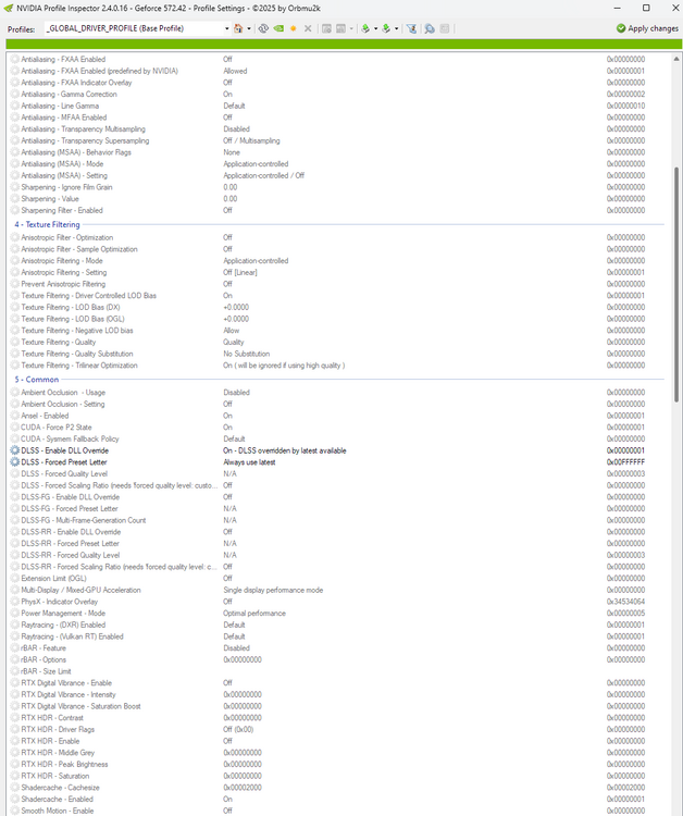 Can anyone please suggest what I am doing wrong? I have an RTX 4090 I've done a clean install of Geforce 572.42 drivers I have installed Nvidia Profile Inspector 2.4.0.16 In Nvidia Profile Inspector, I have set 'DLSS - Enable Override' to on, and 'DLSS Forced Preset Letter' to always use the latest However, using the 'show DLSS indicator' reg tweak in 2D (it won't display for me in VR), it shows that DCS is using 'Render Preset C - DLSSv3 v3.7.0 D3D11'?? Thanks