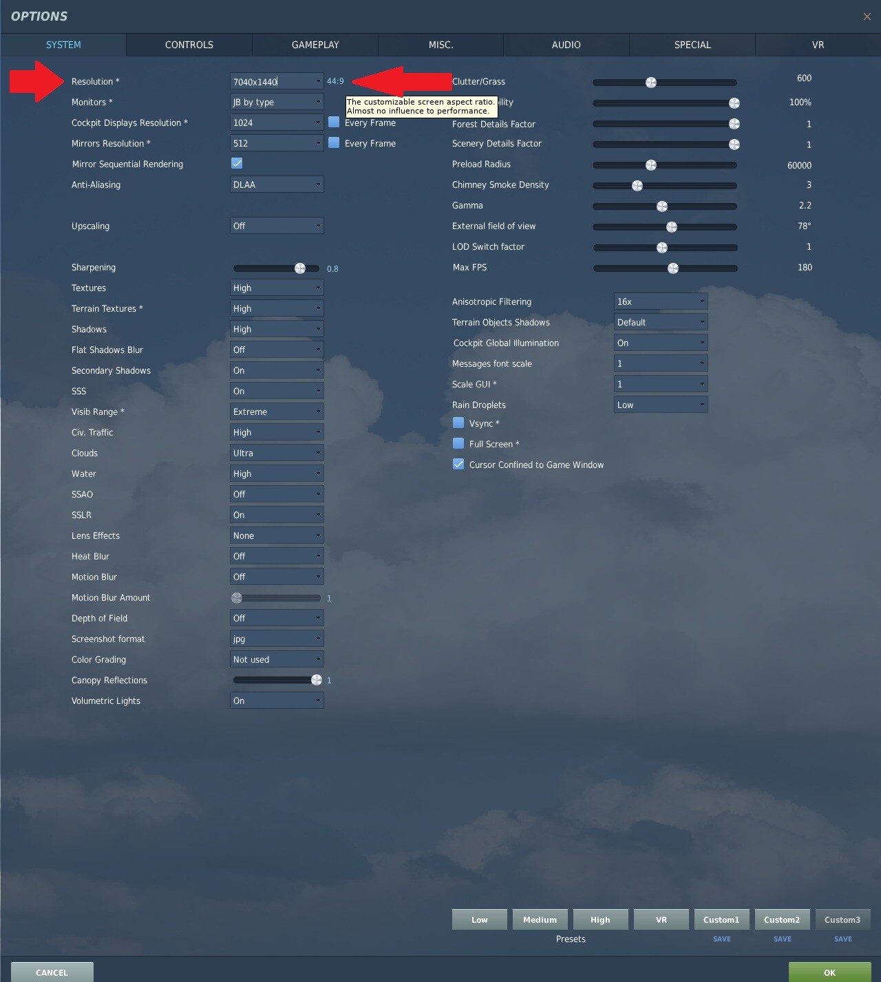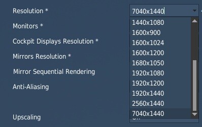 You CAN NOT manually type the resolution into the box in the DCS Launcher. You have to start the game fully to the fullscreen "Menu" screen, then go into the settings menu (COG Wheel) Click in the resolution box, you will see the cursor appear, delete what is already in there and type your desired resolution (Custom resolutions normally appear at the very bottom of the drop down list) Custom resolutions normally appear at the very bottom of the drop down list Then you have 2 option: Select 1 Screen in the "monitors*" line - This will give you a wide screen view looking forward across your 3 monitors or 3 Screens - will give you a 90deg LEFT view, a FWD view, and a 90Deg RIGHT view. If you end up with a black bar down the right hand side, you have exceeded the maximum resolution DCS or your Graphics card can handle.