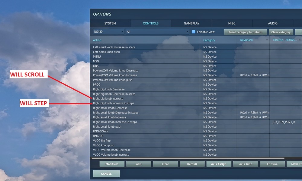 Was there any way to do this for the keyboard? So one key press is one notch. I've tried adjusting the timings in voice attack, but I can't get it to be consistent. Sometimes one press in voice attack is one notch and sometimes it's two with the exact same timing. EDIT: Never mind, I looked at @CHIC code and applied the same to the keyboard default.lua. I also made it so that there is individual bindings for scrolling as the default, and in steps which I've added. I can't see how to make it one step per click but then scroll if you hold it down, and I couldn't find any aircraft where that happens on a similar dial. So here is version 1.25 of the mod, OvGME ready GPS Rotary Encoder Fix v1.25.zip -