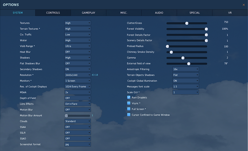 for the test i don't even move the TADS at all. I am pretty certain that if you are looking at sky or empty desert land, the results on FPS will me much different. To answer your question, no I'm not exporting displays, just simple pancake screen (ultra-wide) with TrackIR. Maybe the clues are in the forest details and visibility. I can try using your settings to try to figure out what is the x-factor here. Attached are my settings: null