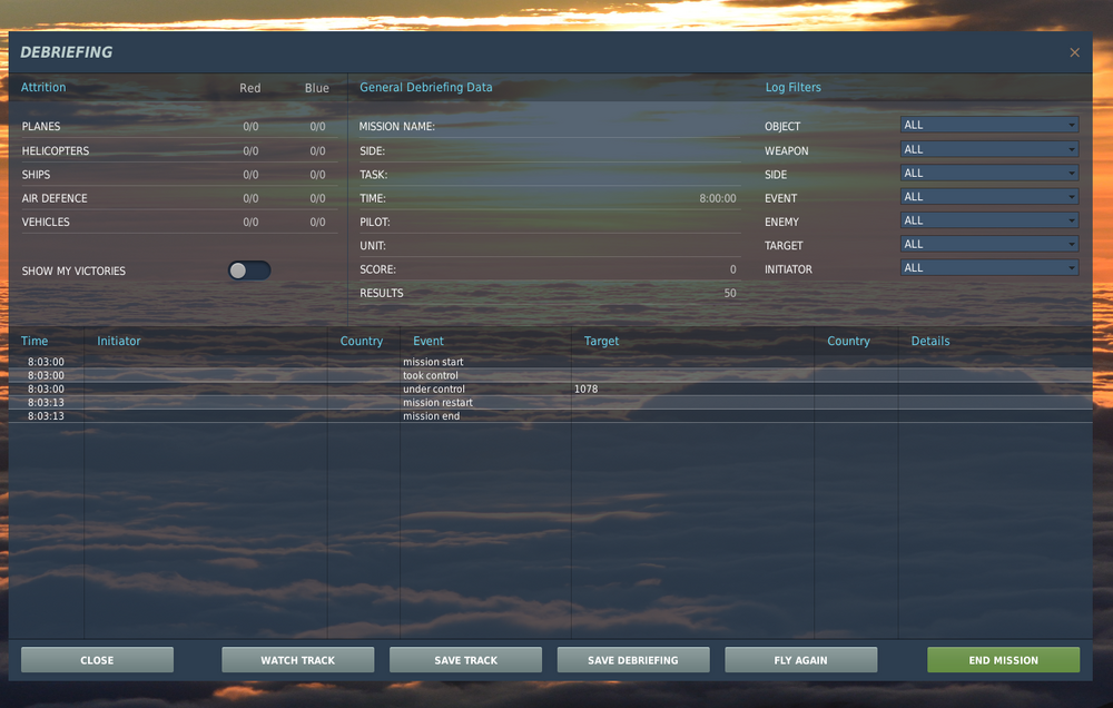 I'm hijacking this thread because the title works. When I try to skip the first part it just takes me to the mission complete screen and from there the end mission button is non-functional, clicking it does nothing. I can hit fly again and it starts me back at the beginning on the carrier or I can hit the X is the upper right and quit but I can't skip the intro of the mission. Am I doing something wrong? The attached image is what I get after trying to skip the beginning. -