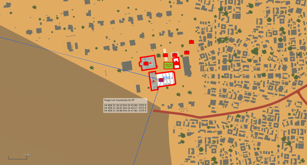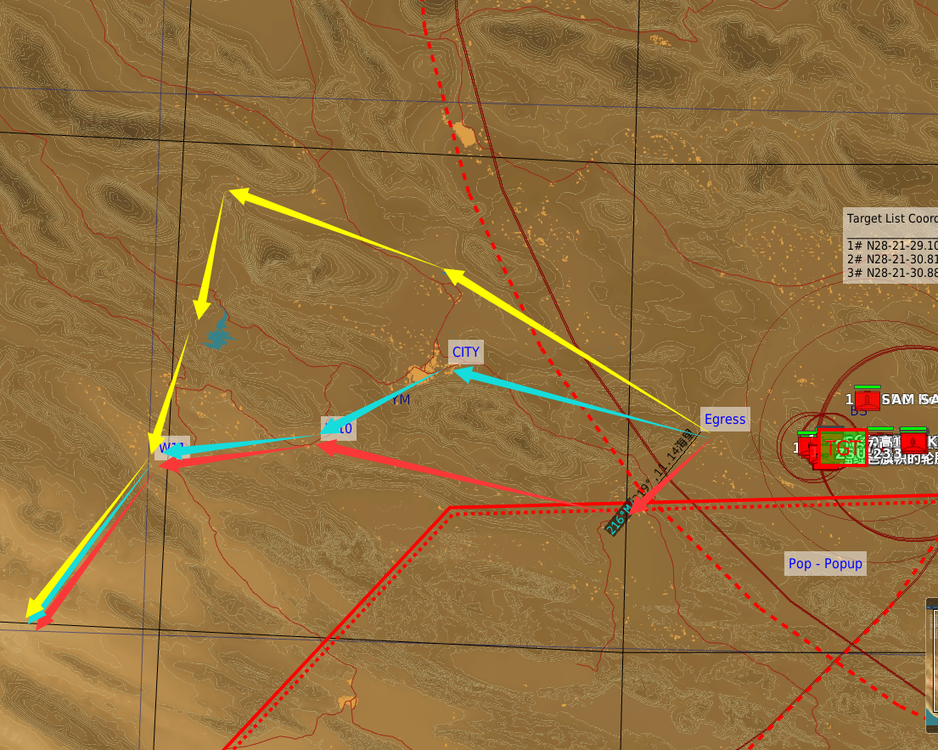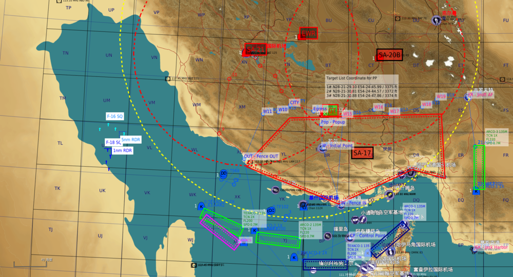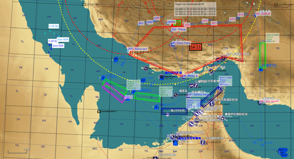 任务简介 我们在哈吉阿巴德镇(BS44)发现了一处敌军的重要的工业设施,任务要求蓝方(BLUFOR)使用携带侵彻战斗部的武器彻底摧毁该工业设施中的三个指定的建筑。为了蓝方需要在这个夜间发动一次对目标的纵深打击。 任务将由部署于迪哈夫拉基地的 F-16C 和航母打击群的 FA-18 各一个小队负责执行。 任务气象 开始时间:3月12日 当地,0100 时、深夜、满月 疏云 云底高约 16000 英尺,地面风 290 度 3 米 / 秒 湍流:23 % 能见度:优秀 己方资产 林肯号航母打击群(ABL CSG)的 F/A-18C 四机小队: 呼号 Roman 5(机号 101 - 104):执行对预设目标(PP)的精确打击任务(Pinpoint Strike); 阿联酋迪哈夫拉空军基地 F-16C 四机小队: 呼号 Viper 8(机号 116 - 119):执行任务区防空巡逻和扫荡(SEAD); 两个海军前置打击分遣队(TF68、TF102)正在海上封锁任务,并在当地建立防空警戒。 E-3A,呼号 Magic,位于卡塔尔沿海上空提供 AWACS 支持; KC-135MPRS,呼号 Arco-1 / 2 / 3,在预设航路执行空中加油待命并提供软管空中加油支持(TCN 1X) KC-135,呼号 Texaco-1 / 2,在预设航路执行空中加油待命并提供硬管空中加油支持(TCN 2X) 任务目标 1)摧毁工业设施中三处指定目标。 2)所有参战单位战损小于 2 架。 威胁情报 空中威胁 根据设定,红方可用机场为两处: 克尔曼机场 - 侦察未见有军用战术航空器活动。 设拉子机场 - 确认有一个中队的 F-14A 型战斗机部署,并具备不低于 4 架的快速战备出动能力。我们认为基于此情报将红方的 F-14 出动时间设置在 5 分钟以内的最佳战备状态。 防空威胁 目标设施所处的哈吉阿巴德镇周边部署有数量较多的短程防空武器系统,主要是以 ZSU-23-4(23mm)、S-60(57mm)、K-19(100mm)组成的高炮,并且都配置有火控和测距雷达。另外还确认了至少有一台较为先进的 SA-22“铠甲”防空系统出现在目标东北面附近约 5nm 的两个预设机动阵地中的其中之一位置。在补充信息中,我们还得知有另外两台铠甲处于静默状态在目标区周边。 根据电子情报侦察(SIGNIT)确认在任务区的以南地区至沿海,宽 230nm 纵深最大达 100nm 的近矩形区域中(东至米纳卜,西至布什尔)有一个 SA-17 机动发射连(改进型“山毛榉”防空导弹,一个连拥有六台一体化发射车,每台发射车均具备自主交战能力)被分散部署,并且目前处于静默状态上,可能会在受到攻击后被激活。这会影响到打击机队可能向南的脱离航线。SIGNIT 还确认了另一套 SA-20B(S-300PMU2)防空导弹发射营被部署在了纳贾夫沙尔镇(CT66)附近方圆约 26nm(50km) 范围内,但由于图像情报的缺失以及该发射营进入静默状态,暂无法准确定位。 在设拉子机场我们确认了一套处于活动状态的 SA-21(S-400)防空导弹发射营的部署位置。 情报认为,所有的红方防空(SAM)和对空拦截系统(GCI)都受到在设拉子东北山区中设置的早期警戒雷达(EWR)的控制和指挥。同时,活动状态的 SA-21 也将会为红方空防系统提供数据支持。已知的 SAM 和 EWR 的作用范围已经标定,我们可以肯定一旦这些节点探测到蓝方的活动,将会促使红方做出迅速的反应。 任务计划 1)Roman 小队挂载 - G31 x3、TK x2(C、RWI)、TPOD、AC、9X x2 2)Viper 小队挂载 - HARM x2、TK x2、HTS、ECM、TPOD、AC x2、9X x2 3)起飞后 Roman 与 Viper 完成各自的进入前 AAR; 4)在 CP 组成打击包 - Viper 在前扫荡队形、Roman 各机以间隔 1nm 的交错纵队在 Viper 尾后 5nm 以上保持雷达跟进; 5)按计划前往 IP,保持 6000 MSL 以下,注意地形和 RWR; 6)抵达 IP 后 Viper 直接转脱离点,开始对脱离航线执行防空压制扫荡。所有机队打开 ECM。 7)Roman 越过 Pop 后开始爬升,同时检查空情(Picture)确定脱离方向,在距目标 6nm 前达到投弹高度(10000 MSL +),由长机带领依次向目标投放武器。 8)按计划脱离,若按计划为向西撤离,Roman 则不要越过 Viper,若改向东撤离,则注意利用地形防御 SA-20B 可能的攻击。 9)离开威胁范围后恢复高度,并准备返航 AAR。 战术构思 由于目标位置信息准确,且目标周边存在有较为先进的短程防空武器系统。为了降低攻击目标时面临的风险、同时简化攻击的时效窗口,决定由 Roman 机队为主对目标投放 GBU-31/V4 JDAM,并迅速撤出作为基本打击方案。 对红方处于活动状态的雷达和防空网络 LOS 覆盖的分析表明,由于 SA-17 处于未开机的状态且红方 EWR 所在的位置探测目标区以南受地形影响,对低于 6000 MSL 飞行器探测存在阻隔,因此经评估认为进入行动区可采取最短最近的航线执行。具体执行中,以低于 6000 MSL 高度直飞目标,经过几个地标参考点后,在距目标 5 - 10nm 处跃升并投放 JDAM 后迅速下高脱离。Viper 机队将会位于整个打击包的前端为 Roman 侦察航线安全并扫荡可能出现的防空。 我们认为按照预设计划,机队在发起打击前被红方发现的概率较低,突防有较高成功率。一旦打击开始,跃升的机群将会被红方预警雷达探测并触发红方警报。因此打击必须迅速且一击得手,由于 JDAM 的射程优势,打击机群将不会进入到目标区近程防空武器系统的威胁范围内。 虽然存在打击后直接向南的最短撤离路线,不过由于攻击后极大可能出现 SA-17 在极近距离射击的威胁,我们还是决定将撤离航线选择绕开 SA-17 的威胁区域。打击包在打击完成后应迅速脱离,Viper 机队依旧将会先于 Roman 转向至脱离航线,并应对可能的防空威胁,正常情况下,Roman 将会在投弹完成后直接转向脱离航线并尾随 Viper 撤出,但由于原地撤离航线距设拉子较近,如