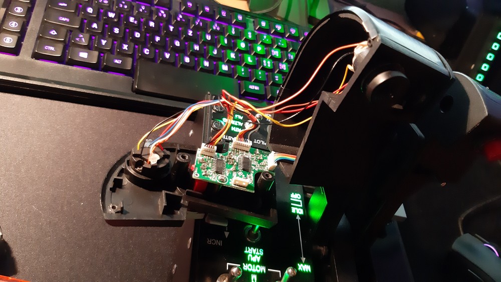 I have a problem with my TM Throttle. The Slew-Cursor does not function. Only the Center Button gives a Signal. I replaced the Cursor but the problem is still there. My suspicion is a defect on the circuit board. Have anybody an idea, how I can check the curcuit board? Thrustmuster offert me a new board, but I will be sure, there is realy an defect. I checkted (continuity check) the cable from the Board to the "Mainboard". There was no issue. Thx for any ideas!