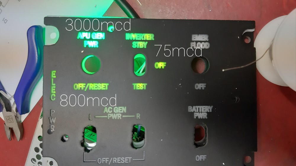 I made a little bit progress on my prototype panel but I have to improve the engraving. I have LEDs with 85 mcd. In my opinion it's not enough. What are you using? How much mcd has your LEDs?