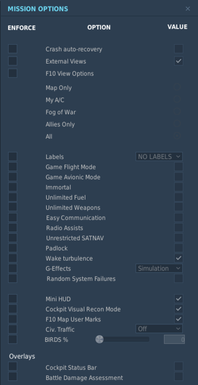 Have you ever created a mission??? You call it an option, but the crux of the problem is that it's NOT an option. See this list of options below? These correspond to options in the "Gameplay" section of the regular options menu. This section of the mission editor allows the mission creator to select whether or not he/she wants to enforce a certain option one way or another, or just leave it up to the user's local settings. So for example, a mission creator can enforce labels off or on, or they can just leave it up to the settings of each user if they don't care. Do you see takeoff assistance anywhere in this list? Well, It's not on the list. A mission creator should either be able to choose whether or not it's enforced, or it just shouldn't be enforced. As it is right now, if my friend and I want to fly together, and he wants to use takeoff assist and I don't well tough <profanity>. One of us is going to be unhappy. Do you understand what I'm saying? Also, I figured out why I was still able to use my personal options when flying those missions in SP... I have the "No force from mission, use mine" setting on. I never even saw it was there on the bottom right of the gameplay options until just now. @Art-J You might want to check and see whether or not you have this option on, it may stop takeoff assist being on in the aforementioned training missions. -