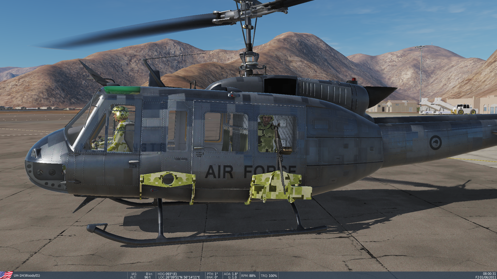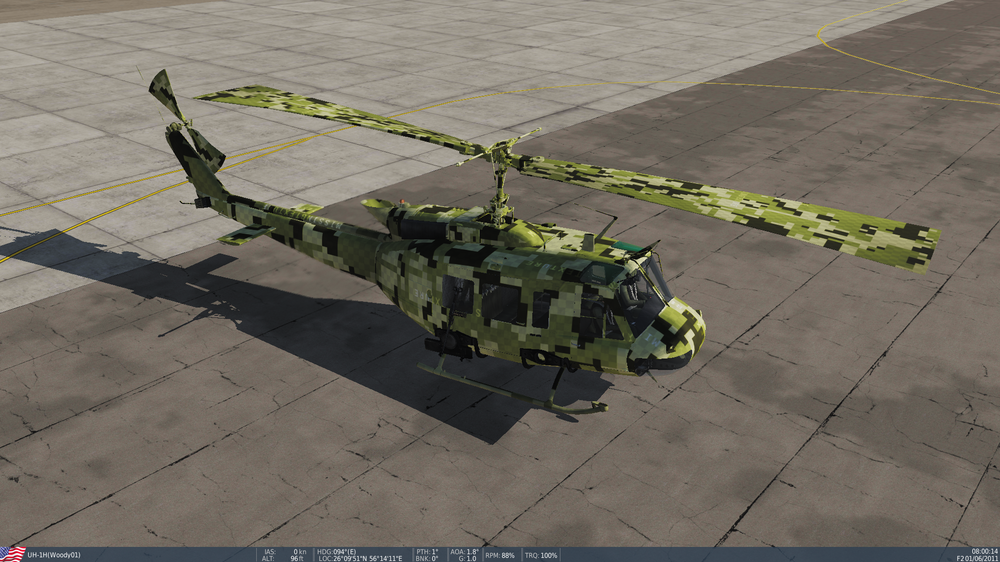 Thanks a lot! That has mostly solved the issue, the only thing I have now is one panel that's not right, any ideas? This is what the description in the .Lau files says, I followed the instructions and cant see where Ive gone wrong. livery = { {"civ_uh1_main_dam", 0, "uh1_rnzaf_body.dds", false}; {"civ_uh1_main_dam", 2, "uh1_spec", true}; {"civ_uh1_tail_dam", 0, "uh1_rnzaf_tail.dds", false}; {"civ_uh1_tail_dam", 2, "uh1_tail_spec", true}; {"civ_uh1_main", 0, "uh1_rnzaf_body.dds", false}; {"civ_uh1_main", 2, "uh1_spec", true}; {"civ_uh1_tail", 0, "uh1_rnzaf_tail.dds", false}; {"civ_uh1_tail", 2, "uh1_tail_spec", true}; {"uh1_main_dam", 0, "uh1_rnzaf_body.dds", false}; {"uh1_main_dam", 2, "uh1_spec", true}; {"uh1_tail_dam", 0, "uh1_rnzaf_tail.dds", false}; {"uh1_tail_dam", 2, "uh1_tail_spec", true}; {"uh1_main", 0, "uh1_rnzaf_body.dds", false}; {"uh1_main", 2, "uh1_spec", true}; {"uh1_tail", 0, "uh1_rnzaf_tail.dds", false}; {"uh1_tail", 2, "uh1_tail_spec", true}; {"uh1_weapon", 0, "uh1_weapon_blk", true}; {"pilot_UH1_01", 0, "pilot_UH1_01", true}; {"pilot_UH1_02", 0, "pilot_UH1_02", true}; {"pilot_UH1_helmet", 0, "pilot_UH1_helmet", true}; {"pilot_UH1_patch", 0, "pilot_UH1_patch_1_cavalery", true}; {"Gunner_UH1", 0, "gunner_UH1", true}; {"uh1_cov", 0, "uh1-UN_cover", false}; {"UH1-cpt-door", 0 ,"UH1_door_c",true}; {"UH1-cpt_karkas", 0 ,"UH1_karkas_c",true}; {"UH1-cpt_karkas2", 0 ,"UH1_karkas2_c",true}; {"UH1-cpt_panel", 0 ,"UH1_panel_c",true}; {"UH1-cpt_central_box", 0 ,"UH1_boxs_c",true}; {"UH1-cpt_dev2", 0 ,"UH1_dev_2",true}; {"uh1_rotor_alfa",0,"uh_1_blade.dds",false}; } countries = {"USA"} Thanks again!