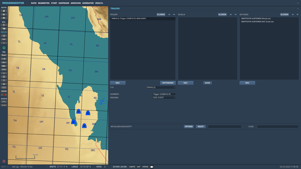 Hello, I really need some help, this Moose-RAT-Thing is driving me crazy. :badmood: I'm able to successfully create some group of airplanes: local a380=RAT:New("RAT-A380") a380:SetCoalitionAircraft("neutral") a380:SetCoalition("sameonly") a380:SetTakeoff("cold") a380:Spawn(5) local b727=RAT:New("RAT-B727") b727:SetCoalitionAircraft("neutral") b727:SetCoalition("sameonly") b727:SetTakeoff("cold") b727:Spawn(10) local b737=RAT:New("RAT-B737") b737:SetCoalitionAircraft("neutral") b737:SetCoalition("sameonly") b737:SetTakeoff("cold") b737:Spawn(10) Then suddenly, when I try to add one more group, all planes disapear (no spawn) in the mission. Even when I revert the changes in the lua file and delete the new group - all planes are gone. This happens randomly sometimes also when I even add the second group of planes. At some point I were able to get it back working, when I delete and recreate the trigger, which executes the moose.lua & Rat.lua. Sometimes I have to delete everything. I spend some hours on this problem, but there's no pattern recognizable. I'm on Open Beta 2.5.3.22877 and the Persian Gulf Map. :helpsmilie::helpsmilie: -