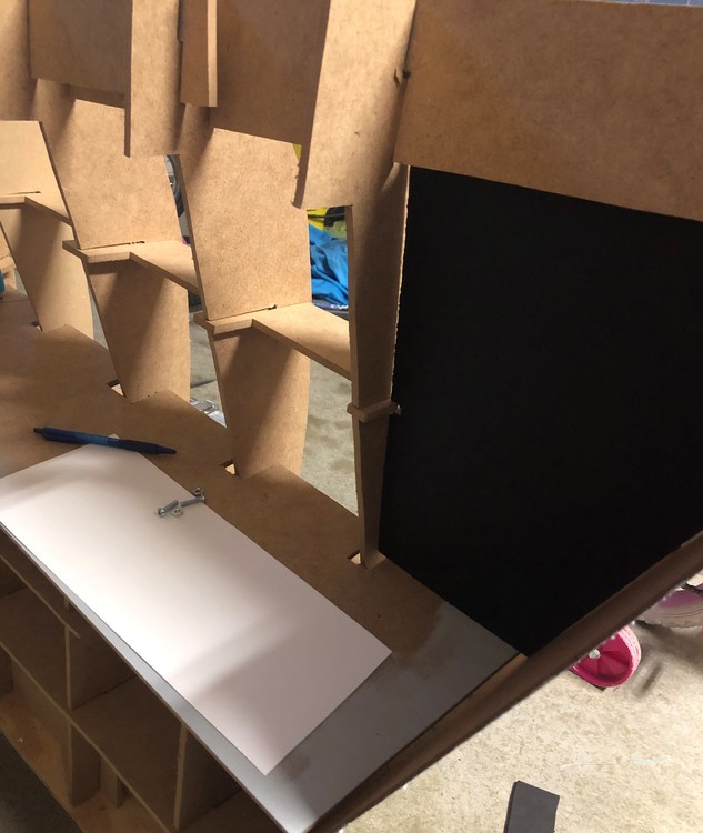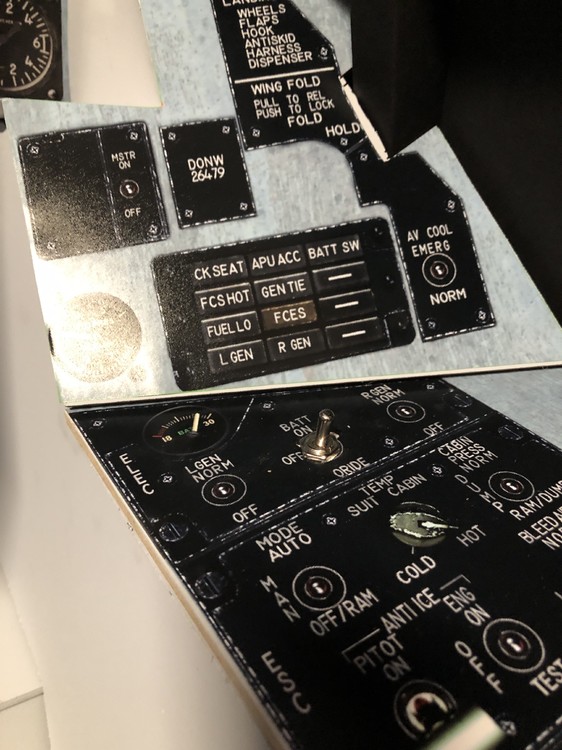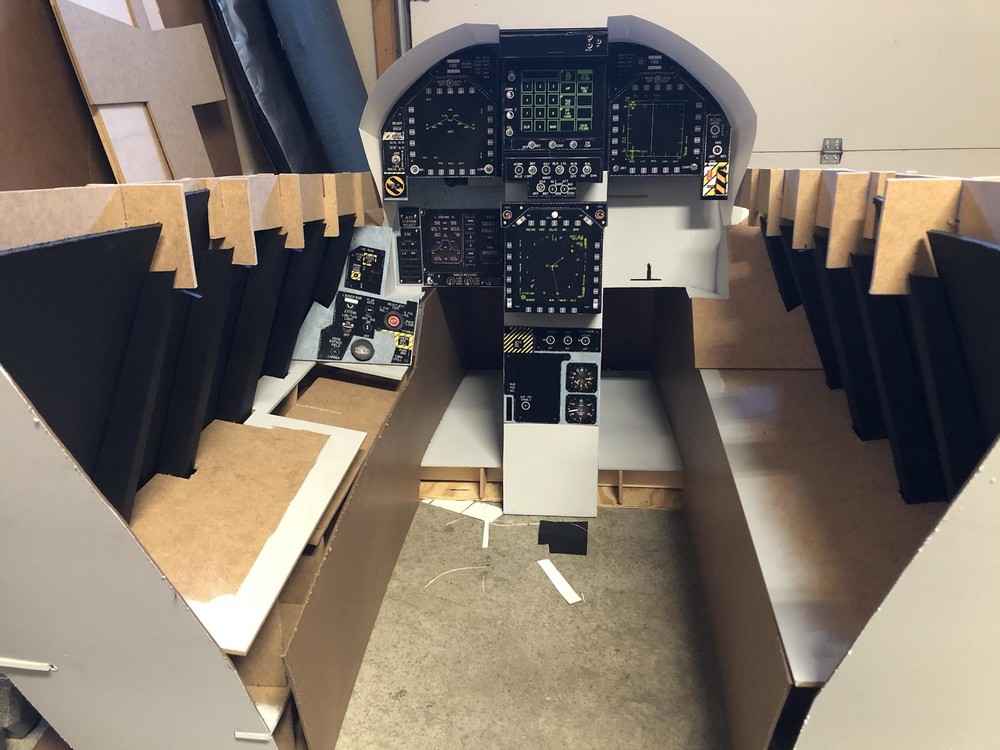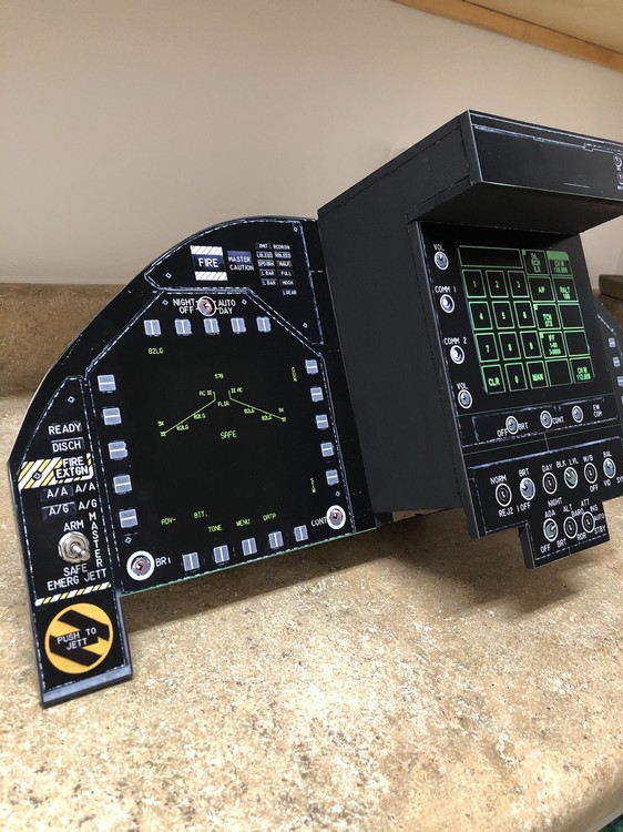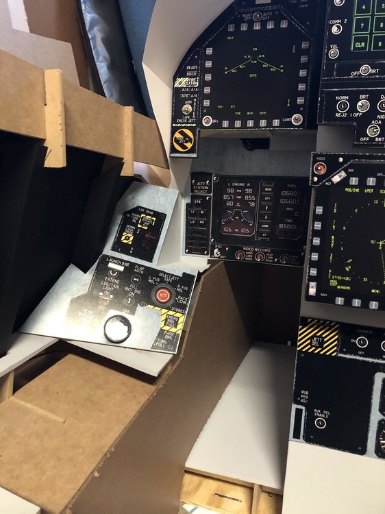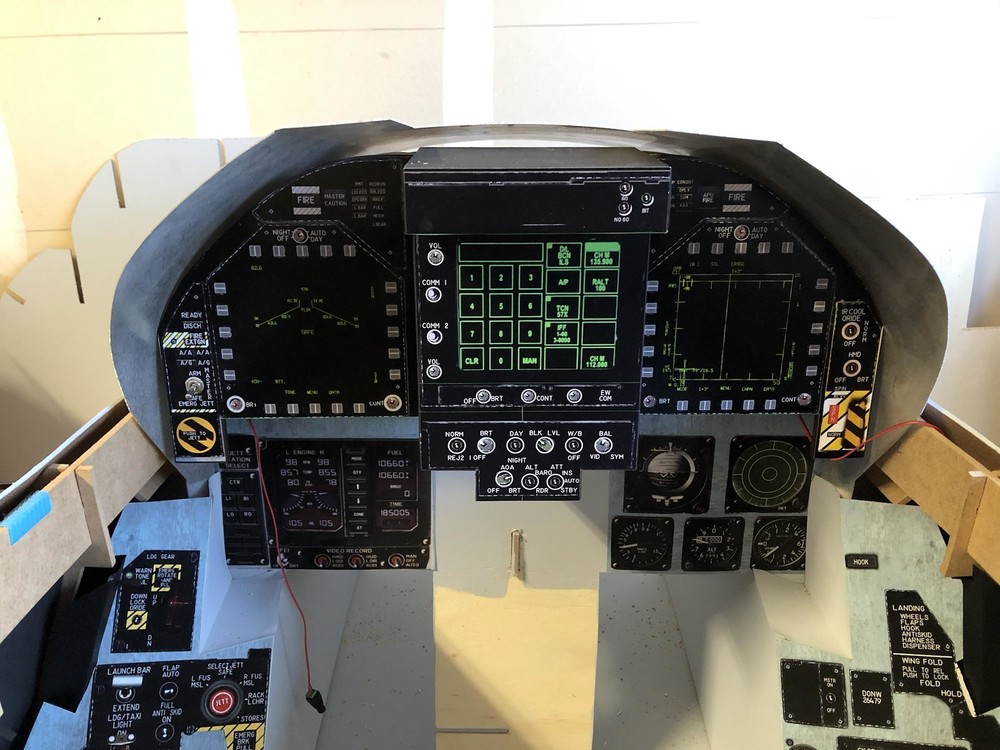 Now I started to work on the lower center panel: Here is the instrument panel on and the lower center panel: Painted and pictures applied, foot floor panel made and painted: Then onto making the arm side panels, and the panels for the landing gear and hook: I made the side ribs and back panels out of poster board cut to shape: Ribs/side back panels installed, applying pictures to the gear and hook panels: Made the lower side panels and it’s starting to come together a little: Front panel cut, and painted: -