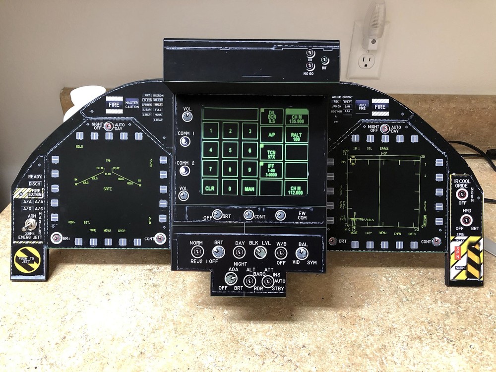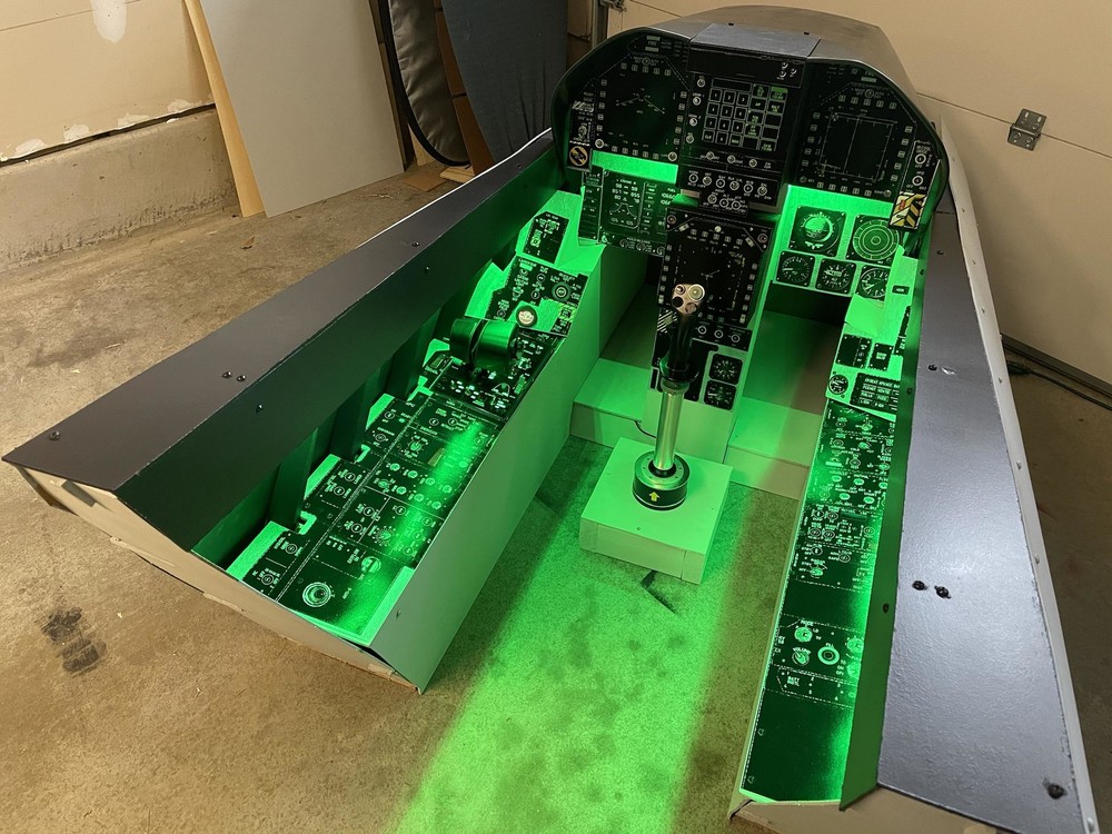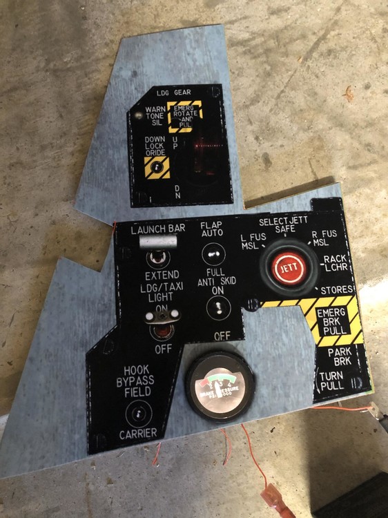 I really wanted to put something in the cockpit that came out of a real F-18 so I went on a search. I just wanted something like a switch or something small. Ended up with a real brake pressure gauge out of an F-18: It wasn’t going to fit in the cockpit like this so had to disassemble it: I needed it to be fairly short and didn’t need all the mechanicals on the back of it so I removed them and was left with this: The wires that were left connected seemed to go to what should be a light, so, I tested it with a battery and behold, light! I also glued the needle in place so it looks like it's in use. Cut out the shape in the landing gear panel and installed it: Here it is installed in the cockpit: Far rear panels painted and installed, and some paint going on the side panels: Starting to add the lights with the upper side rails installed: Side rails painted, pictures installed on arm panels, more lights: Close up of the gauge lit up with the lights: All lit up! Put a switch where the battery switch is in the plane and it controls the lights. I would have put it where the normal lighting dials are in the plane, but that is where the keyboard is going to sit: Throttle, side panels installed: Main outer panels being fitted: Painted!: -