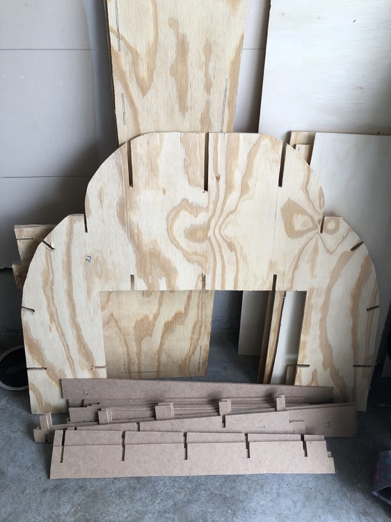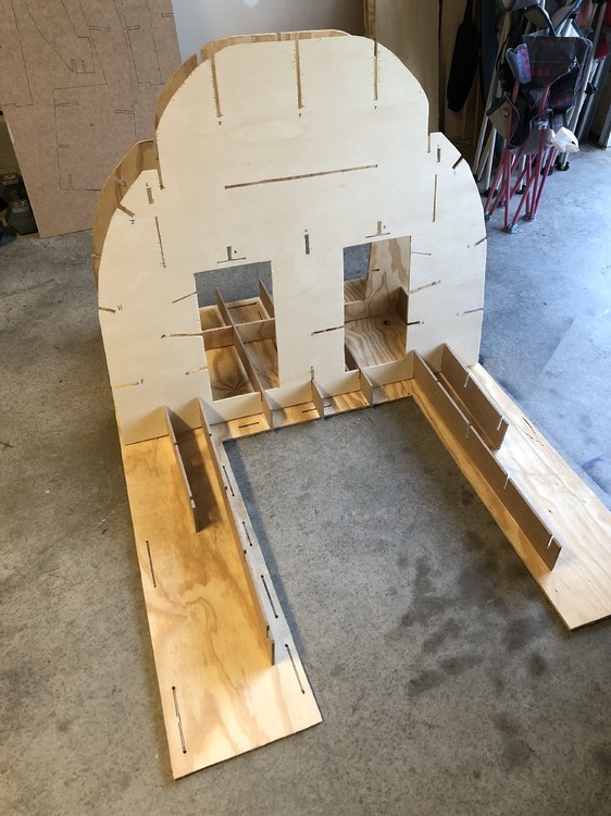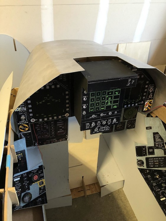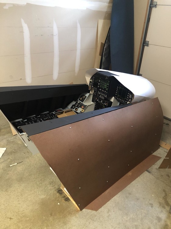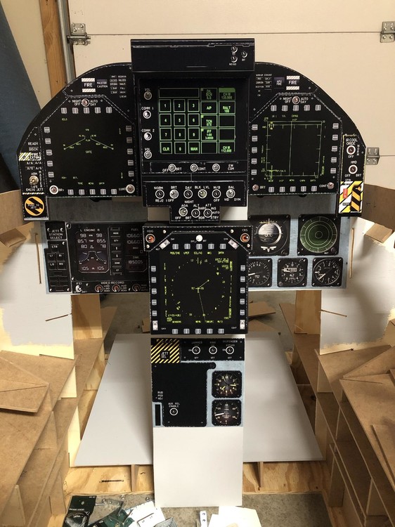 After almost a year, my F-18 cockpit build is complete and this is how it all happened! Here is a time lapse build video: https://www.youtube.com/watch?v=H1O_s5ZH_XE After searching around trying to figure out what kind of home cockpit I wanted to do, I saw this thread:https://forums.eagle.ru/topic/208612-f18-vr-simpit I decided that I was going to build a full F-18 cockpit based on @Shadow912 thread and the dogfight boss plans. Did a little research and off to Home Depot to buy wood and a jigsaw. Little did I know how much work was ahead of me! All of the cockpit pieces were printed out on paper, cut out to shape, traced onto wood, then cut out of the wood. Here is the very first piece printed on the paper and cut to shape which is the left base of the cockpit: And here it is cut out of the wood: The base done: Here are some more shapes cut out I need to put together: Using this thing was a life safer to cut out the printed shapes: Here is one of the frame pieces traced onto the wood ready to be cut out: Some of the pieces cut out: Starting to put some of the pieces together: Here is what the main frame looks like put together: Here is a gif of the main frame going together: Now I started to work in the instrument panel: The pictures are printed onto high quality photopaper and installed onto the wood. The middle of the DDI’s are actually screenshots taken out of DCS and photoshopped into the main pictures pulled from the Dogfight Boss plans. Instrument panel and UFC put together: