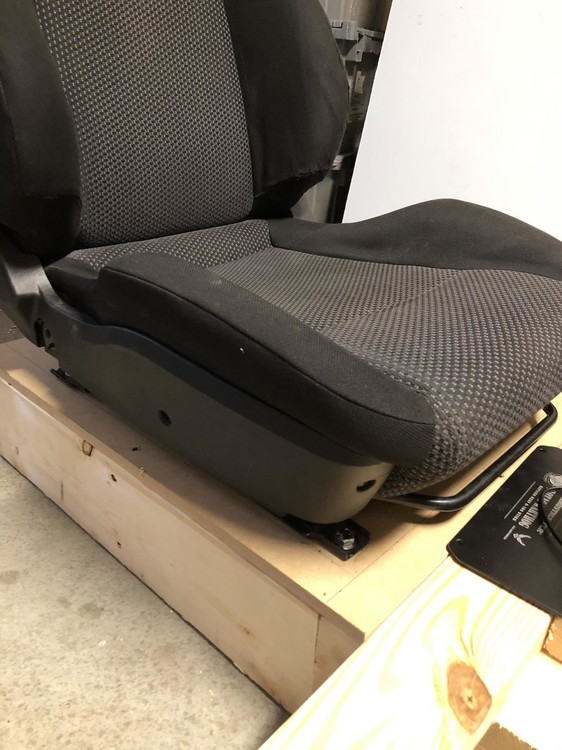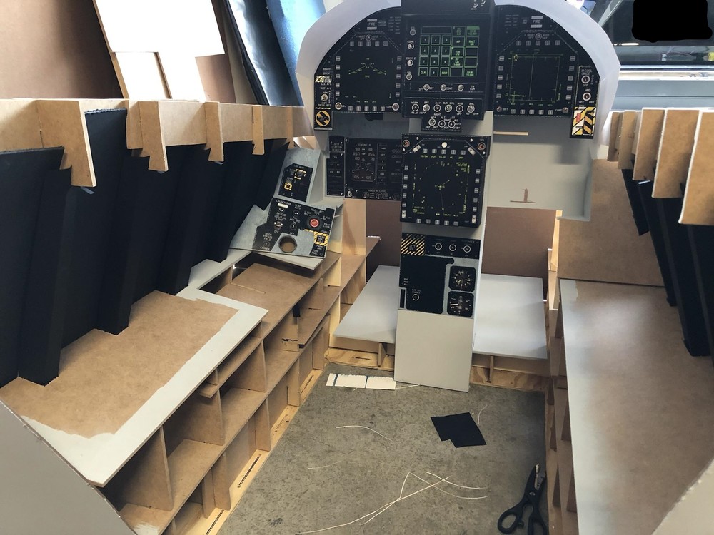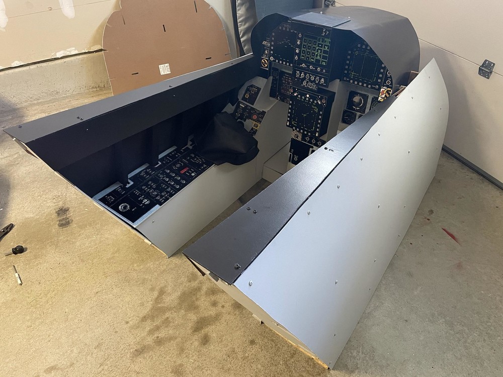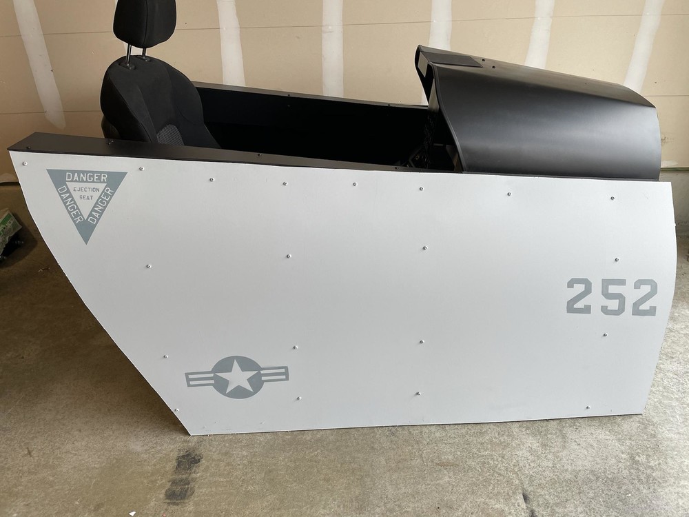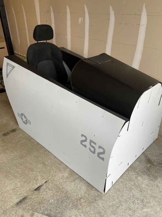 Onto making the sunshade. I bought a piece of thin aluminum from a metal shop and traced the pattern onto it and cut it out: I had to bend it where the bends are in the real cockpit, so I had to get a little creative to do the bends: Test fitting: Painted and retest fitting: Front panel with the sun shield installed: On to the seat! I went to a local junk yard and searched for over an hour for a seat I liked. Ended up liking the look of this one and the frame rails had flat mounting points which I needed for the box frame I was going to build to mount it on. Only $30! Bonus points if you can guess what kind of car it came out of! The seat had some tears in it, so I used my crappy sewing skills to close it up: The front of the seat needed to be cut to fit the stick/extension so I cut it out and added some material to make it look somewhat decent: Here is the seat mounted on the box frame: Putting some wood together to determine how high I need to build the stick mount box: Stick frame built: In the cockpit: Painted: Seat and stick in the cockpit: -