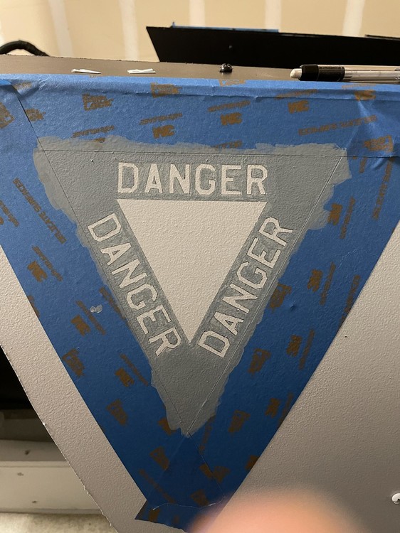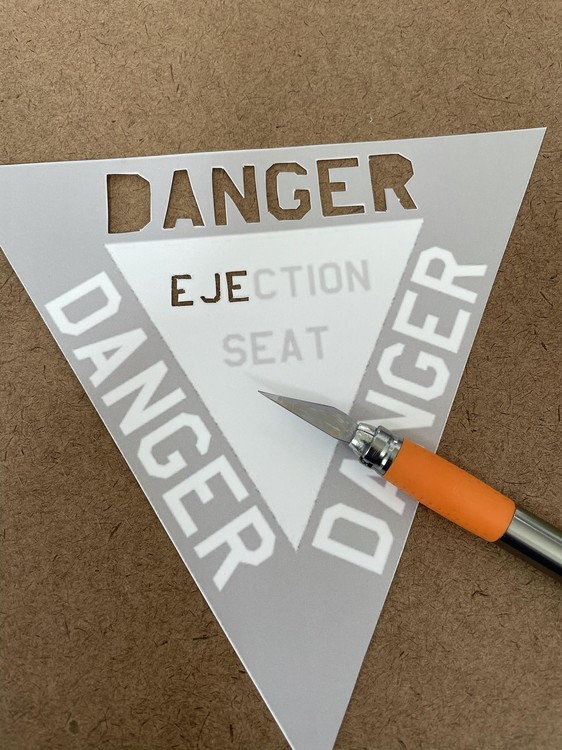 Added edge trim on the sunshade to match the real F-18: My wife painted the numbers and roundel on the sides: I wanted to add the ejection seat triangle warning as well, so I cut out the shape and had to tediously cut out each letter to make the stencil: Stenciled on the plane: In the process of painting: Done: Here is every single piece I used: And the final product! -