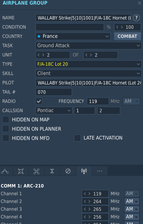 We're a group of friends playing in multiplayer on the stable version and exclusively flying the Hornet. In the Hornet, as soon as you switch the battery switch to "on" (cold start), your comm1 channel1 radio is active. So we've taken this habit, everytime we fly: we jump in our aircraft (cold), we switch battery "on", and immediately perform the radio checks within our own package (we use comm1 / chnl1 as our intra flight frequency), and awaits our leader's orders. But lately we are having issues. In the attached mission are 4 client packages (if you want to quickly find them, check "planes", country: France in the ME's unit list) -Truman BARCAP (3 aircrafts): within the mission editor, you can see that it's comm1 channel1 frequency is set to be 120Mhz -FROG SEAD (2 aircrafts): 118 Mhz -PIKE STRIKE: 123 Mhz -WALLABY: 119 MhZ But once in the plane, most of these comm1/chnl1 frequencies don't match what was set in the editor. The frequency is not even the same within the same group (ie the leader's frequency and its wingman's are different). It's very reproduceable (at least for me). Open the mission in the ME, check by yourself the assigned frequencies to the 4 client packages, then launch the mission, either from within the ME or not, choose a slot and note what's the comm1/chnl1 frequency (if you have SRS up and running, the test will be very quick: as soon as you switch battery ON you'll see the comm1/chnl1 frequency on the SRS overlay. Ifyou don't have SRS you'll have at least to start the right engine to check the value of comm1/chnl1). Do that for all clients aircrafts and see all inconsistencies. IMPORTANT NOTE: the attached .miz was generated by Liberation, so maybe the issue lies there (I have filed a bug report on the Liberation GitHub), but I am still a bit surprised that what is in the actual plane does not match what was in the ME (?) Also, investigating on the above, I realized I had no clue what the herebelow "RADIO" checkbox was for ? What is the purpose of checking or unchecking this checkbox? Thx ! radio_test.miz