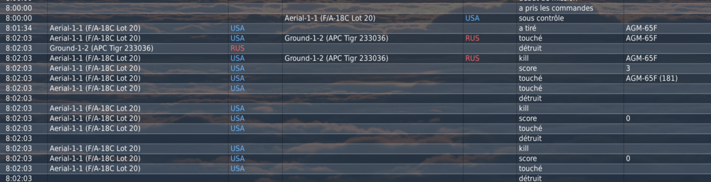 Something I always wondered, and which is now causing me some trouble within a scripted mission development: does anyone know what the AGM-65F(181) means in the herebelow debriefing screen ? And why this line and the following ones are showing up ? I am actually shooting one single AGM-65F to an APC which is part of 2 elements convoy (ie I have APC1 and APC2 moving on a road, rather close to each other, APC2 following APC1). As we can see I have all the events related to my shooting, hitting, and killing the APC, with the right initiators, targets, etc. But then, there is a hit event with no initiator, no target and this "AGM-65F(181)" followed by quite a number of hit, destroyed and kill events, also with no initiator / target ? Many thanks iif anyone can enlighten me