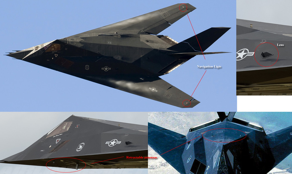 When F-117 was design nobody think abou RCS enhancement. So, retractable are antenas for communications and navigation lights are not retractable (the same on F-22). The lens appear more later...