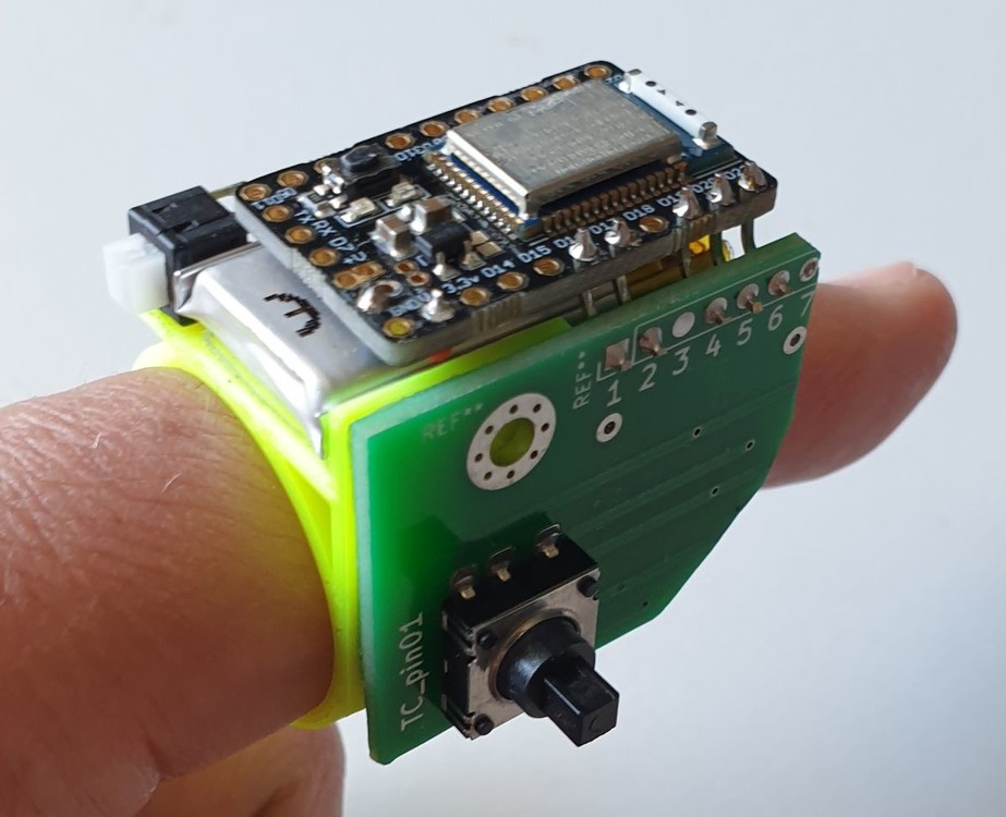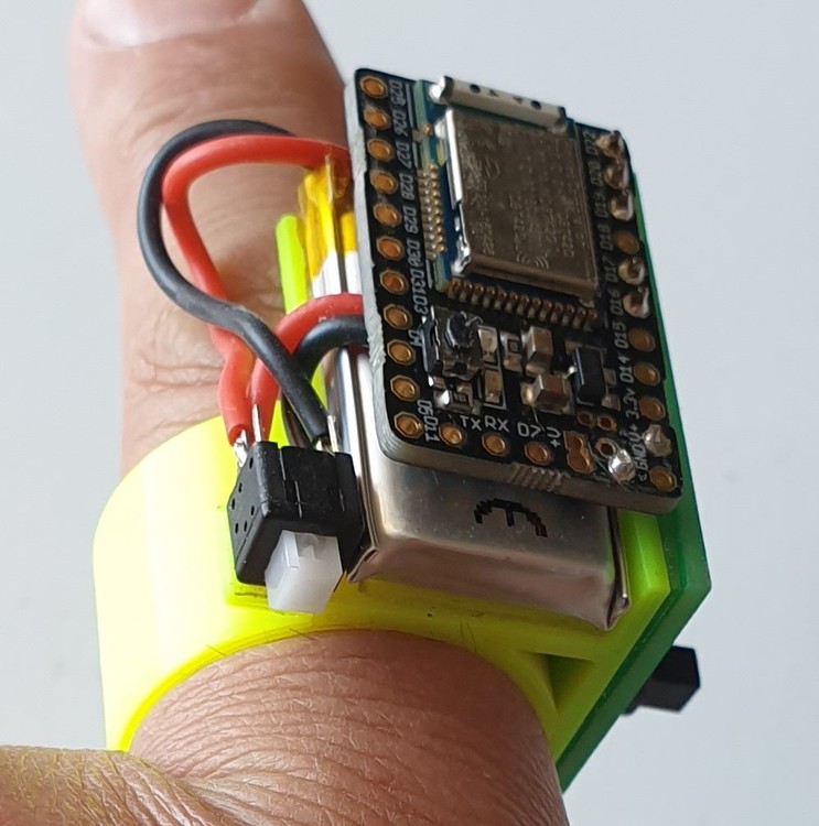 well, my espruino based "very ugly proof of concept" version is working! (left finger only so far, second espruino is on its way) the only issue was caused by my own stupidity; I have forgotten to plug bluetooth antena to motherboard and therefore spent two hours by thinking experimenting why espruino cannot be connected... As you can see, I have decided to build "ring" version with lipo battery (230mAh), as I hate gloves, battery can be smaller in the future, but this one was on my shelf the latching button swtitches on/off, where off can also be a charging mode; charging pins are not soldered yet. the only weird thing is when mouse becomes "white dot"; then it behaves oddly, i.e. moves with headset in oposit direction, (I understand why), but one can get use to it... anyway, guys @frenzon, @Sielu thanks for sharing!