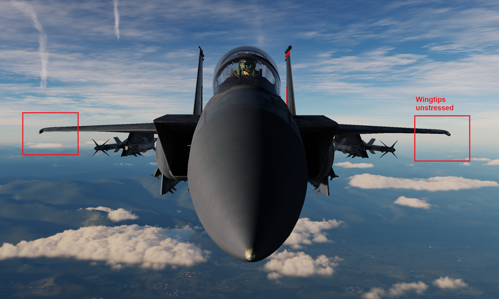Strange fluctuations after getting into wake turbulenceT-B0NE replied to Cytarabine's topic in Bugs and Problems I watched your track and there were afew instances of rapid over G from what I've found the rocking motion is from over G damage to the airframe the F15E isn't fly by wire and won't restrict AOA thus G loading is instant if you pull back to fast on the stick at high speeds. In real life aerodynamic forces are acting upon the control surfaces making quick jolts to the control stick very hard to do but with a simulator Hotas there is no such limitation and worse no flight computer between the controls and flight surfaces to correct for the error like in the F-16 or F/A-18. so ultimately overly rapid inputs can cause structural damage to the aircraft it causes simulated damage to the wingtips of the F15E I think that's why after a few abrupt over G maneuvers the airframe starts to rock slowly side to side in level flight they have also simulated the damage model for this as seen in the pictures below. Otherwise, I do see what you mean about the rudders oscillating like crazy I'm not sure as to why this specific thing is happening. I may not be 100% correct here but it may have something to do with the damaged wing and the Aileron/Rudder Interconnect (ARI) and the Yaw Channel CAS. the F15 series has a system in place to assist pilots who forget or hesitate to use rudder inputs during maneuvers I'm not 100% sure but I think after the damage the YAW CAS was in some way chasing its own tail trying to compensate for the wing dip from the damaged wings and the yaw it was producing but it was overcompensating and thus causing the oscillation if that makes sense. from what I've read online is that the F-15 has strong positive dihedral effect, which produces strong roll in the direction of yaw at all flight conditions at higher speed the wingtip dip from side to side would be exacerbated take into account the left engine failure adding even more yaw and it's likely the Aileron/Rudder Interconnect (ARI) was freaking out the Yaw CAS just a theory would be awesome to see if this was the actual issue. Edit: out of interest I replayed the track took control of the F15 after the oscillation it looks like the left engines feed tank ran dry of fuel explaining why it stopped, I reduced both throttles to idle and used the YAW CAS switch just above the throttle to reset it a few times it worked, and the rudder oscillation stopped completely it looks like it may have been possibly a few factors leading to the CAS freaking or maybe a series of factors like wing overstress/damage and engine failure thus asymmetric thrust also the added possibility of hitting the mirages wake side on too but overall looks like the CAS was going crazy hahaha.