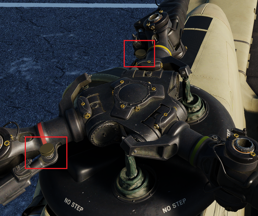 reported Rotor blade pitch varying housing modeling issueT-B0NE posted a topic in Bugs and Problems Seams to be a new issue with some floating objects that look like washers on the updated rotor assembly. Its only visible when varying blade pitch at low rotor RPMs or static it seems to be localized to the rear tail rotor from what I have observed and specifically on the red and yellow hubs where the blade shock absorber bolts to the pitch varying housing.