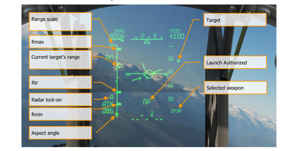 You would think but apparently the number (32) is just for navigation mode. Item 39 is STT range arrow, and item 43 is range from radar quasi scan. As you found item 26 is radar range that you set with the wheel or the GCI commanded range. This comes with some paragraphed that describe most of it “Range scale I with digitalization when working with SEI with the MO-ket radar has the following range scales: 150, 100, 50, 25 and 10 (when working with the OEPRIK only two scales 5 and 1 km). The contour arrow 39 shows the current range and can move along the range scale from 0 to the maximum value. At the ground guidance stage, the arrow shows the current range transmitted via the control unit (Table 2.2). At the on-board guidance stage (ATTACK or homing mode), the arrow shows the current range from the radar control system to the target. The thin line segment 26, moving along the range scale, indicates the current range measured by the radar in the Quazi scan mode in conjunction with the OEPRNK. The crosshair with a gap in the middle 41 in the center of the screens fixes the construction axis of the aircraft and weapons. Aircraft index 15 displays the aircraft position in space by roll. Two lines 19 (to the left and right of the aircraft index) mark the beginning (zero) of the roll scale (Table 3.2). To the right of the aircraft index, a movable pitch scale 25 is displayed with three numbers located vertically, along with artificial horizon line 22, intersecting the screen. The numbers of positive pitch angle values are underlined by a segment of a solid line, and negative ones by dashed lines. The pitch angle values are given by the vertical and course information complex (Table 3.2). Small ring 7 in deltaH coordinates and it shows the deviation of the current trajectory from the specified flight trajectory of the aircraft. The pilot must hold this ring in the center of the crosshair. The parameters deltaH and delta course are calculated in the on-board computer according to the specified values from the GCI command line(Table 2.2), and the current values of height and course, measured on board using the IK-VK-80. The large ring with point 14 at coordinates delta pitch and delta heading shows the deviation of the current flight path from the specified one, calculated in the on-board computer using data. During correct piloting, the pilot holds the ring on the crosshairs (frames the crosshairs with the ring).Large ring without point 18 - mark of deviation of course and glide path from the given trajectory of the aircraft. It is used at the landing stage of the aircraft. Rectangle 6, called the range strobe, is used to select a target and capture it for automatic tracking by superimposing the rectangle on the selected target. In the AVT. mode, the strobe is controlled by the on-board computer. The strobe is controlled by angles and range in manual mode from the KU-ZI key located on the RUS. Dash marks 5 and 8 are marks of detected targets, which are displayed on the screens in the REVIEW and SNP modes. A dash mark with a symbol like PARACHUTE means "own" target, i.e. a target with an identification mark. Rhombus 17 in coordinates 4 and 48 indicates the position of the target in space, since it records the position of the equal-signal direction of the antenna in the RNP mode (Table 3.3). The thickened horizontal lines 40, 38 and 37 along the range scale show the dimensions of the missile launch zone. Line 40 characterizes the permitted maximum launch range for a non-maneuvering target (Dr 1), Line 38 characterizes the maximum permitted launch range (Dr 2) for a maneuvering target, and line 37 marks the minimum permitted launch range (Dmin). The abbreviation 23 ОТВ is displayed on the screens when the ОТВОРОТ command is issued, or when Dmin is larger then present range. In this case, ring 14 quickly moves to the upper left or right corner of the indication field, indicating the rational direction of the turn. The abbreviation PR means LAUNCH ALLOWED, after this command the pilot has the right to press the BC button. Arrow 36 at the beginning of the range scale shows the direction of the target speed vector in the horizontal plane. It lights up after the RLPK switches to the RNP mode. The direction and module of the vector are determined by the RLPK data and calculated in the BCEM. Section 34 of line in the lower part of the indicator shows the position of the search zone in azimuth relative to the viewing zone. Dashed lines 33 indicate the presence of weapons on all six suspensions. Depending on the position of the EXTERNAL-INTERNAL toggle switchlocated near the throttle, either two internal (middle) or four external lines are illuminated. The numbers 30 above the dashed lines are illuminated after passing the built-in control in the RGS (numbers 1 and 2) or after target acquisition by the TGS of missiles R-73 and R-60M (numbers 3, 4, 5 and 6). If the number is framed by a square 31, this means that there is an emergency failure of the missile to leave the suspension. Letters 35 and 29 indicate the readiness of the course-gliding system to land. The numbers 32 indicate the range to the landing point (landing airfield, radio beacon) or the range of manual input of the control lever if the index 42 is displayed. The upper part of the indicators displays flight and navigation information. 4 indicates the GCI received speed, and 3 indicates the current flight speed of the fighter in kilometers per hour. Under the line of these numbers, a movable benchmark 2 is displayed, which can occupy three fixed positions under the middle of the line or to its edges. The middle position indicates that the current flight speed does not change. With an increase in speed (positive acceleration), the benchmark occupies the extreme right position under the line, with a decrease in speed, the extreme left position. The movable scale 10 with three two-digit numbers and a fixed reference point 9 indicates t