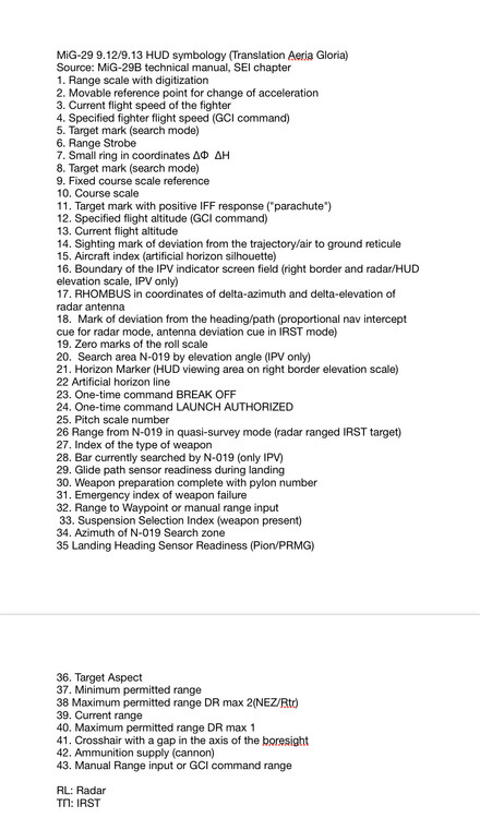 I think there are more reasons we don’t see un modified 9.12 carrying ER then “it’s radar couldn’t handle it.” Such as many of those operating countries not buying ER, or saving it for there Sukhoi’s. Correlation does not equal causation. There is a MiG-29 manual for 9.12/9.13 that says with the same software update that introduces KMOD, R-27ER integration is added, BZPP-4. Our version has KMOD, the Bosnian units in 1991 had KMOD. Many old manuals talk about it. Not to to mention the tracking specifics of the radar allow us to also say if a certain manual is for this software or not. I won’t post it but to quote it “FEATURES OF USING SUV WITH BZPP-4 AND BZPP-4A BLOCKS Or BZPP-4D 1. The MIG-29 aircraft, which has a control system with the BZPP-4 permanent memory storage units in the RLPK and BZPP-4A in the OEPRNK, has the following main differences from the MIG-29 aircraft, which has a control system with the BZPP-ZD units in the V RLPK and BZPP-4 in the OEPRNK: a) BY RLPK: - ensures the operation of the radar under conditions of exposure to the following types of active interference: - noise, when using coordinate support for range and speed from the control unit and when guiding by voice: - response active interference (speed-distorting, Doppler noise and false Doppler frequencies): - the kinematic method of determining the range (KMOD) mode to the noise jamming target has been introduced: - the lower limit of the speeds of low-speed targets such as a helicopter, at which the radar-control system ensures their stable detection and capture in the PPS from ranges of less than 23 ZPS from ranges of less than 17, has been reduced from 210 to 180 km/h tracking of the target is ensured when passing 4/4 angles in mode D at the start of the target maneuver at a range of less than 15 km. In mode B, tracking of the target is ensured through 4/4 angles against the background of free space, and against the background of the earth when the interceptor is flying at altitudes of more than 2.5 km at ranges of less than 10 km; - the minimum range of detection and target acquisition when the radar is operating in mode B in the PPS has been reduced from 10 to 5 km. - the minimum approach speed for target detection and acquisition in D mode at ranges less than 15 km and in BL.BOY mode at ranges less than 10 km has been reduced from 150 to 50 km/h, and target tracking in D mode is also ensured at speeds close to those equalized when the interceptor is lowered to carry targets, ranges: in TP (STROBE) mode with the interaction enabled, radar range measurement, the D" maxt" mark and the D" min. min mark equal to zero are displayed. When the laser range appears, the Dimakst, Dimaks and Dimin marks are displayed. The MIG-29 aircraft, which has a SUV with a BZPP-4D block in the radar, has the following differences from the MIG-29 aircraft, having a control system with a BZPP-4 block in the RLPK: - when the AP-OTKL switch of the APK is set to the OFF position, the interference protection circuit is not disabled. When exposed to interference, its SEI indication is absent, only the AP index is displayed, which is necessary for the AP-OFF-APK switch to be a signal for detecting the jammer. To perform set to AP or APK position - additionally provides generation of target designation parameters and one-time commands for R-27ER missiles (ET, EP) - accelerated adjustment of R-27R (ER) missiles to the radar illumination letter by the pilot on the ground in the air is possible in a time of no more than 70 s B ensures that the automatic tracking mode is maintained during manual switching of the radar control system modes from B to Di from D - the zones of permitted launches for R-27R missiles have been clarified. - when automatically tracking a target in the PPS in the B mode, the target maneuvers when approaching the 4/4 angle of the radar automatically switches to D mode. The transition from D mode to B mode does not occur during the target maneuver - the 4/4 angle is passed at distances of less than 10-20 km (depending on the radar operating mode: B, D or AVT.) when working over a steppe surface. When working over a surface such as a mountain, river floodplain, large above a surface such as a mountain, a river floodplain, an industrial city (district), target tracking drops are possible when passing a 4/4 angle at these ranges: when the COMP switch is turned on, or when the AP-OFF switch is set to the APK ON position the AP index lights up, signaling the inclusion of these modes: - when using interaction in the BB, SHLEM or OPT modes. support for the RLPK is provided in mode 6) According to OEPONK: BB Boy (instead of D mode) …….. symbols 27ER and 73U were introduced (the presence of R-27ER missiles and R-73U training missiles);“