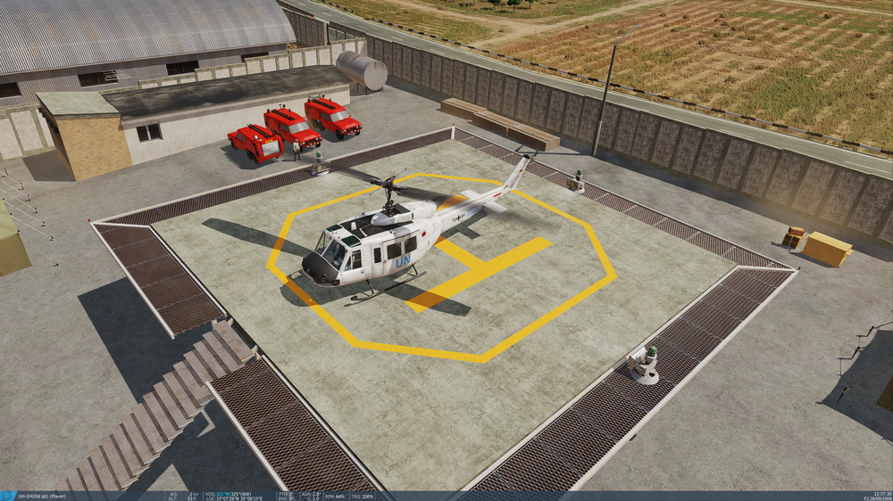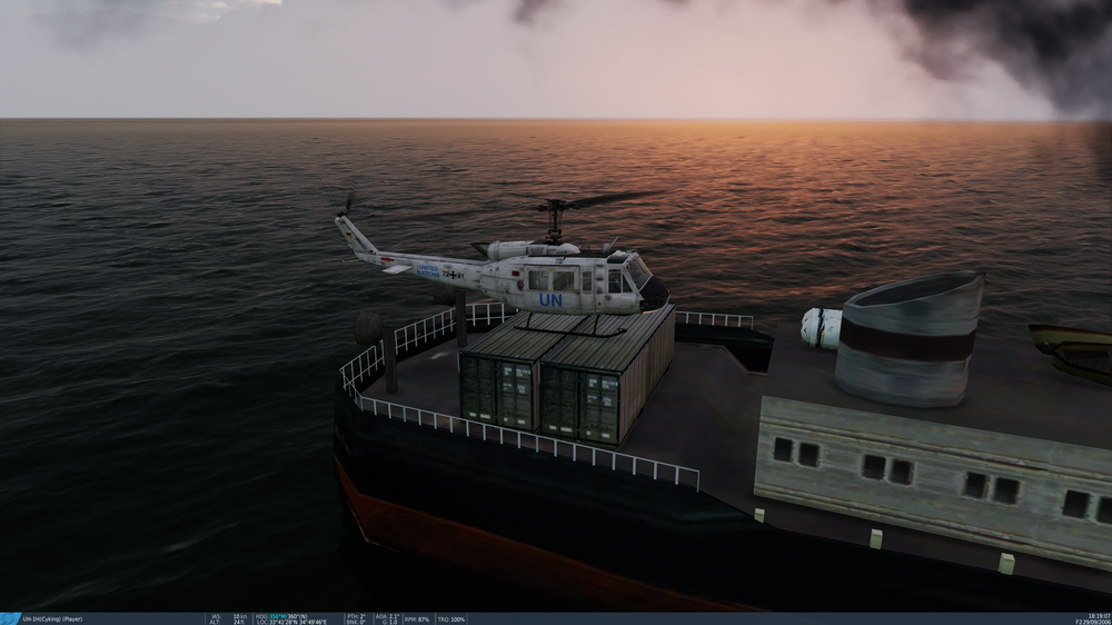 Update: just landed again and could not land more slowly and perfectly. Again, the co-pilot said, "Perfect." Then the Huey just sank down into the two containers, and "game over." It seems INOP right now, sadly.